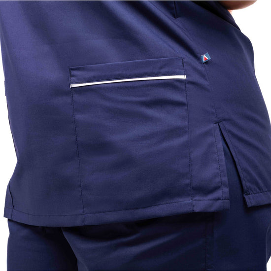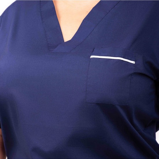 A unisex style scrub top with white trim detailing and a panel V neckline. Features include a chest pocket and two lower pockets with side splits for ventilation. For optimum sterilisation, this garment can be commercially laundered up to 90 degrees.