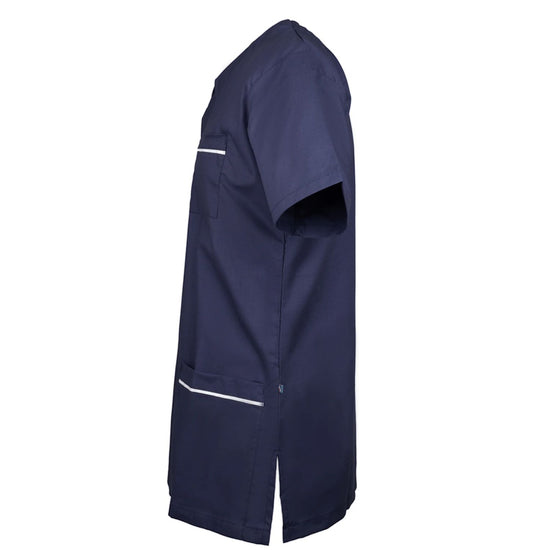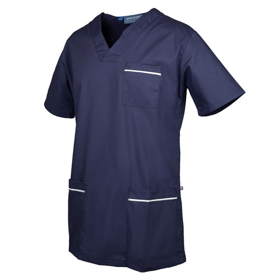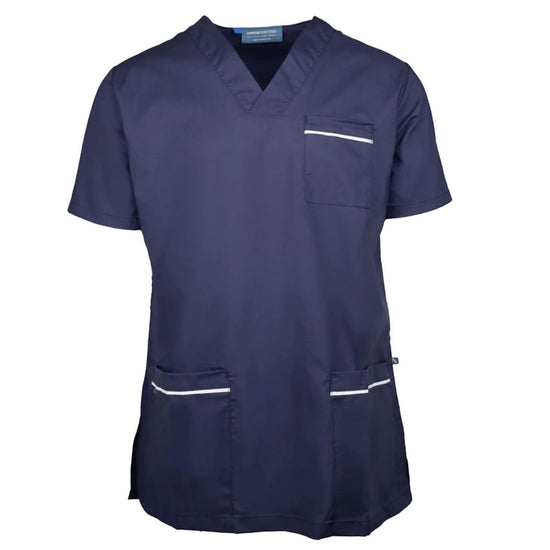 A unisex style scrub top with white trim detailing and a panel V neckline. Features include a chest pocket and two lower pockets with side splits for ventilation. For optimum sterilisation, this garment can be commercially laundered up to 90 degrees.