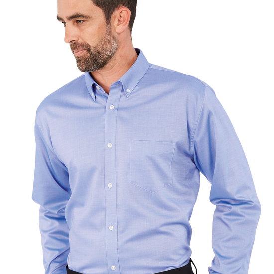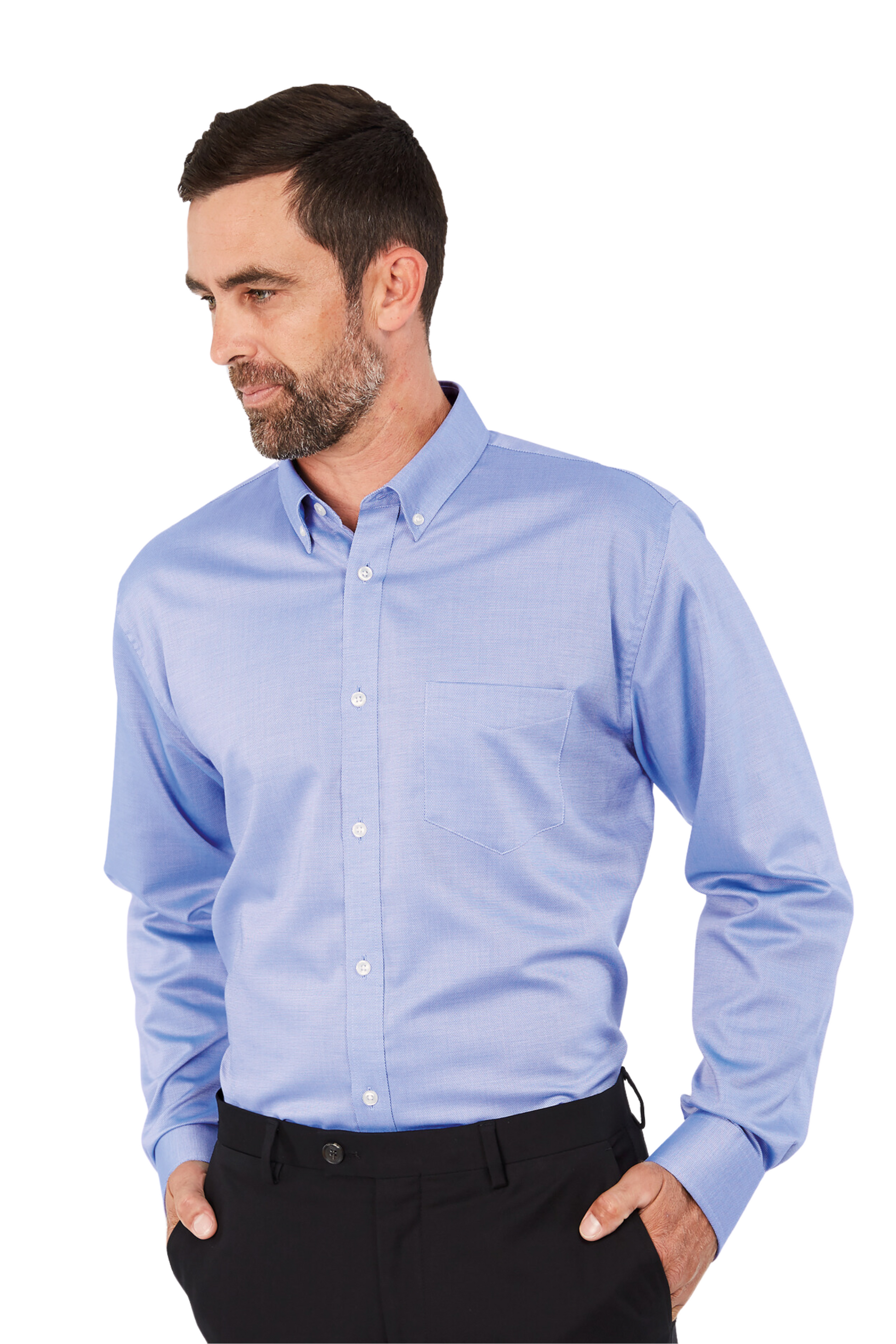 The Clifton tapered fit Shirt is a luxury liquid Ammonia finish for additional strength and luster with a button down fashion collar with back collar button. It features mitred corner detail on cuffs, a single breast pocket- and contrast stitch detailing on selected buttons. The fabric is stain resistant, wrinkle free, is cotton rich with a spandex element for added comfort.