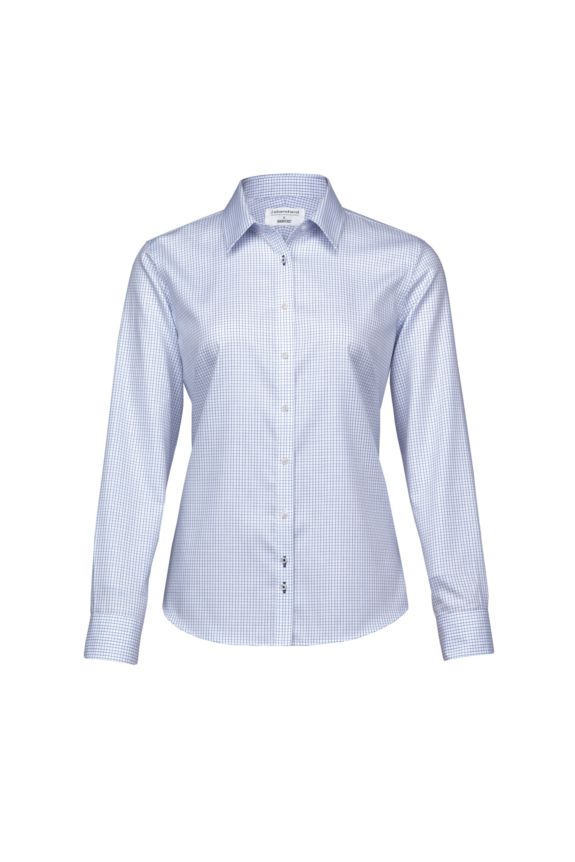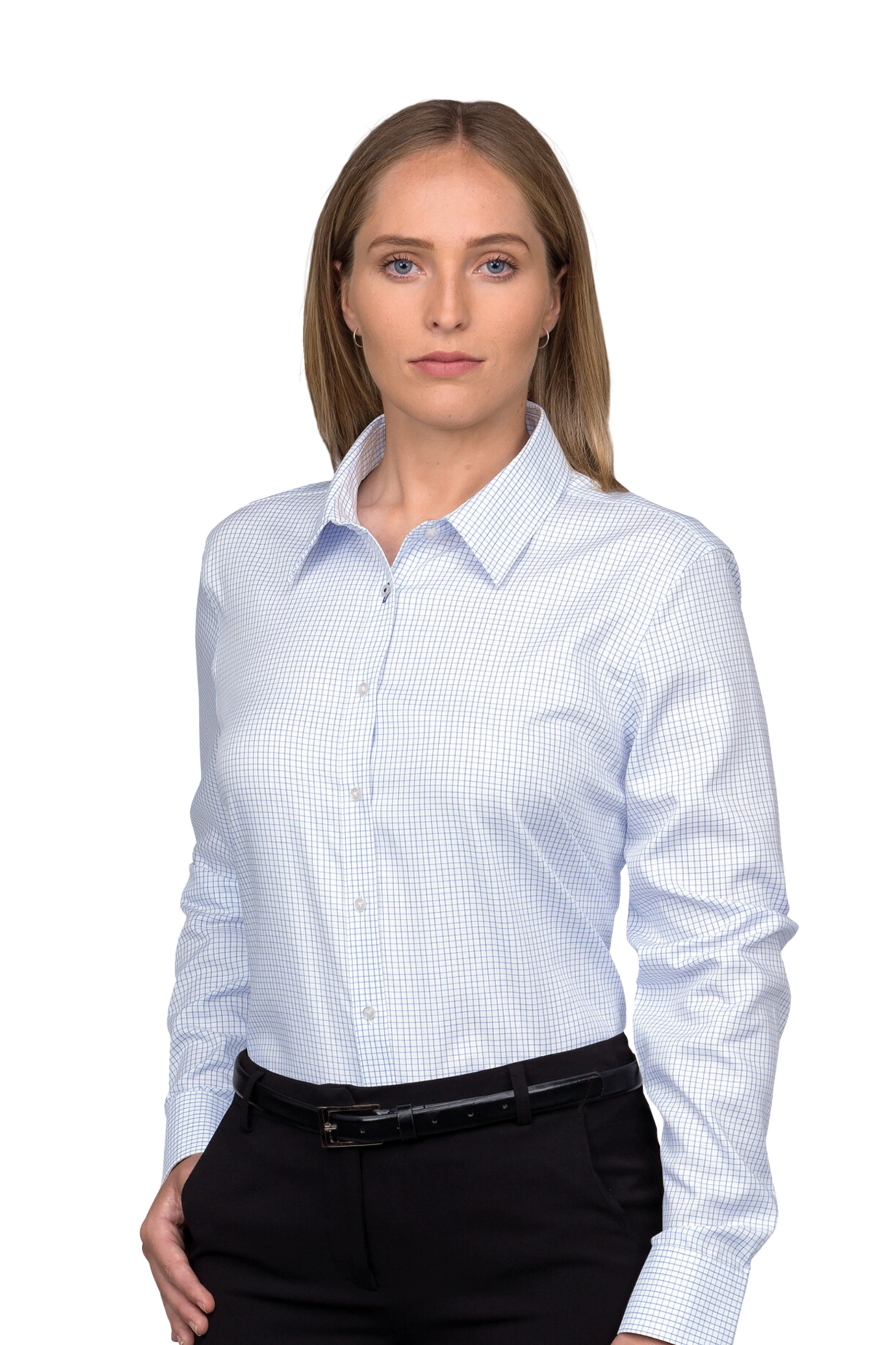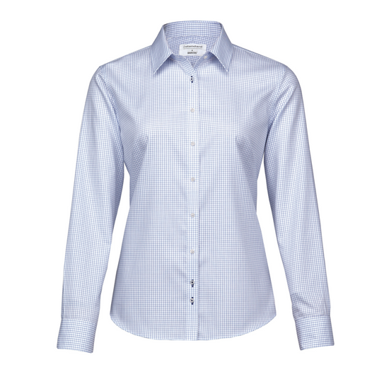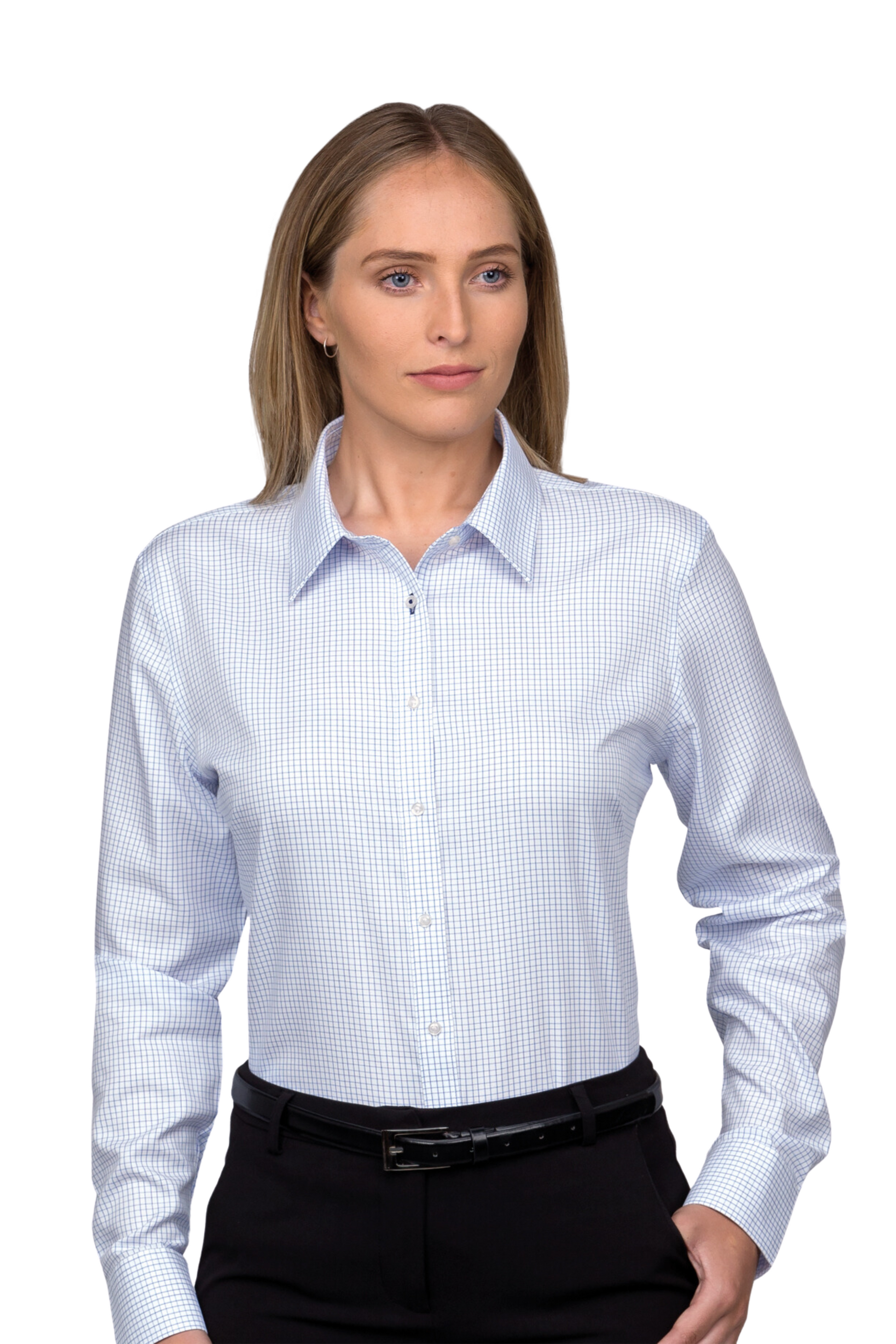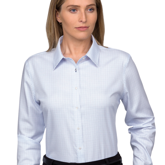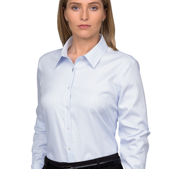 The Lyndhurst long sleeve women's fit check shirt in a luxury liquid Ammonia for additional strength and luster as well as a fashion collar. This garment features a contoured hemline and some contrast stitch detail. The fabric is 100% therefore comfortable and easy care as well as quick drying, moisture wicking and wrinkle free.