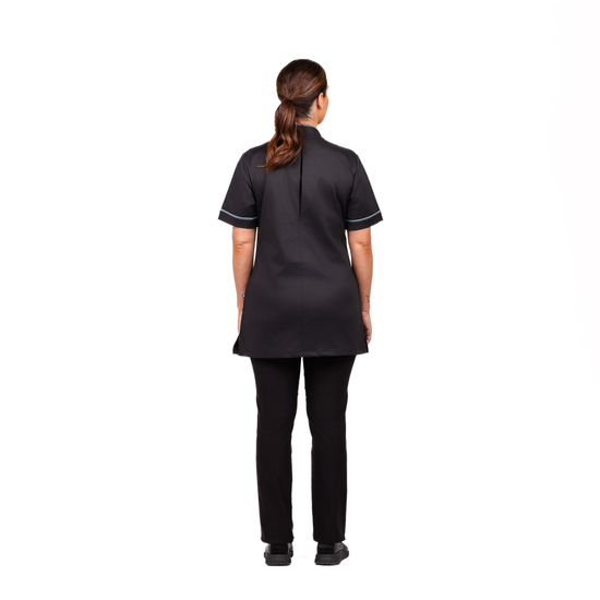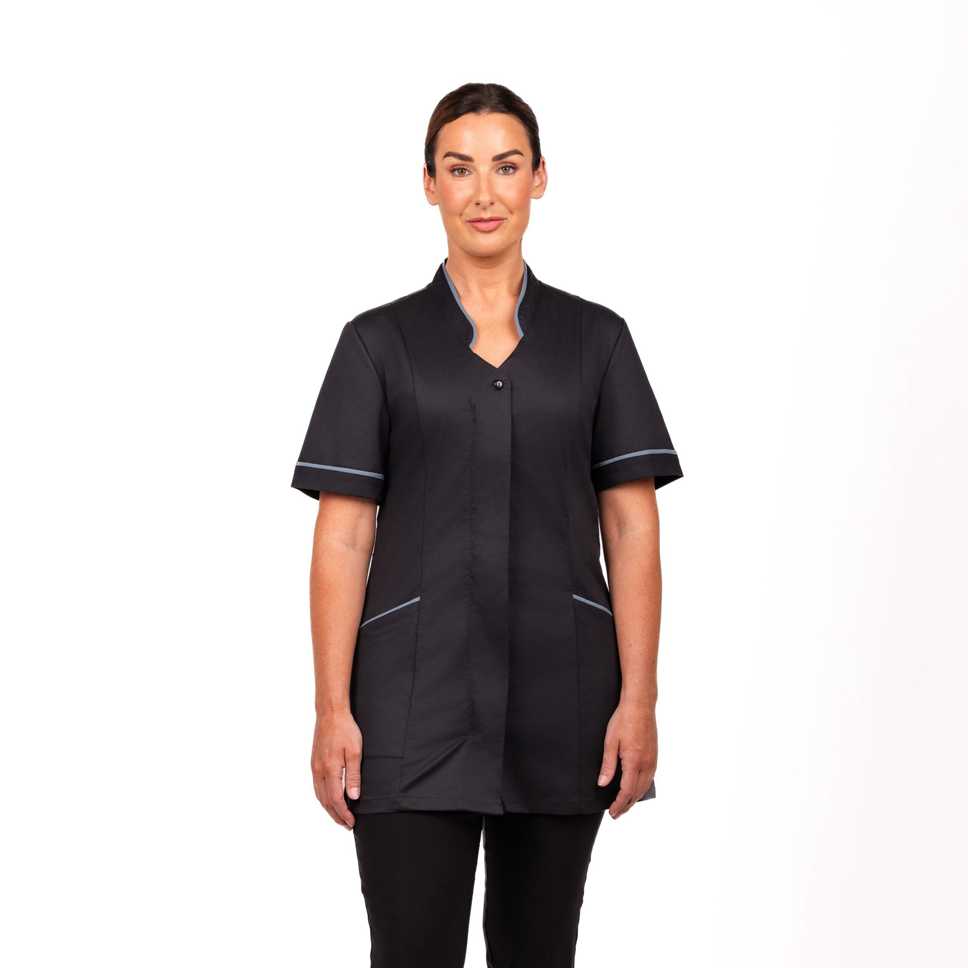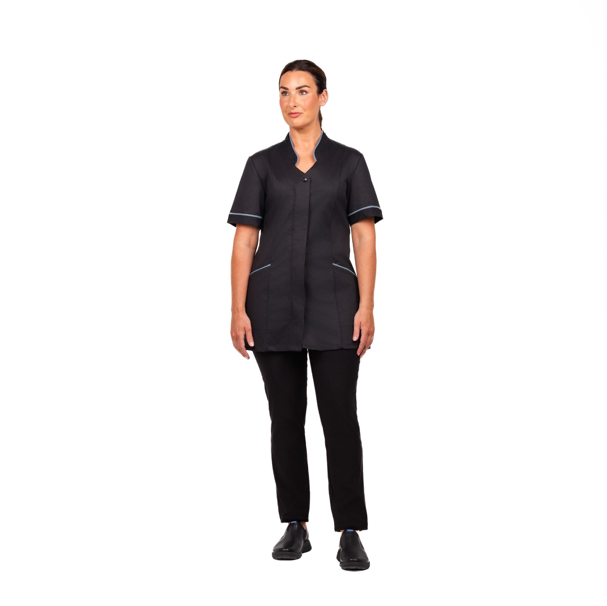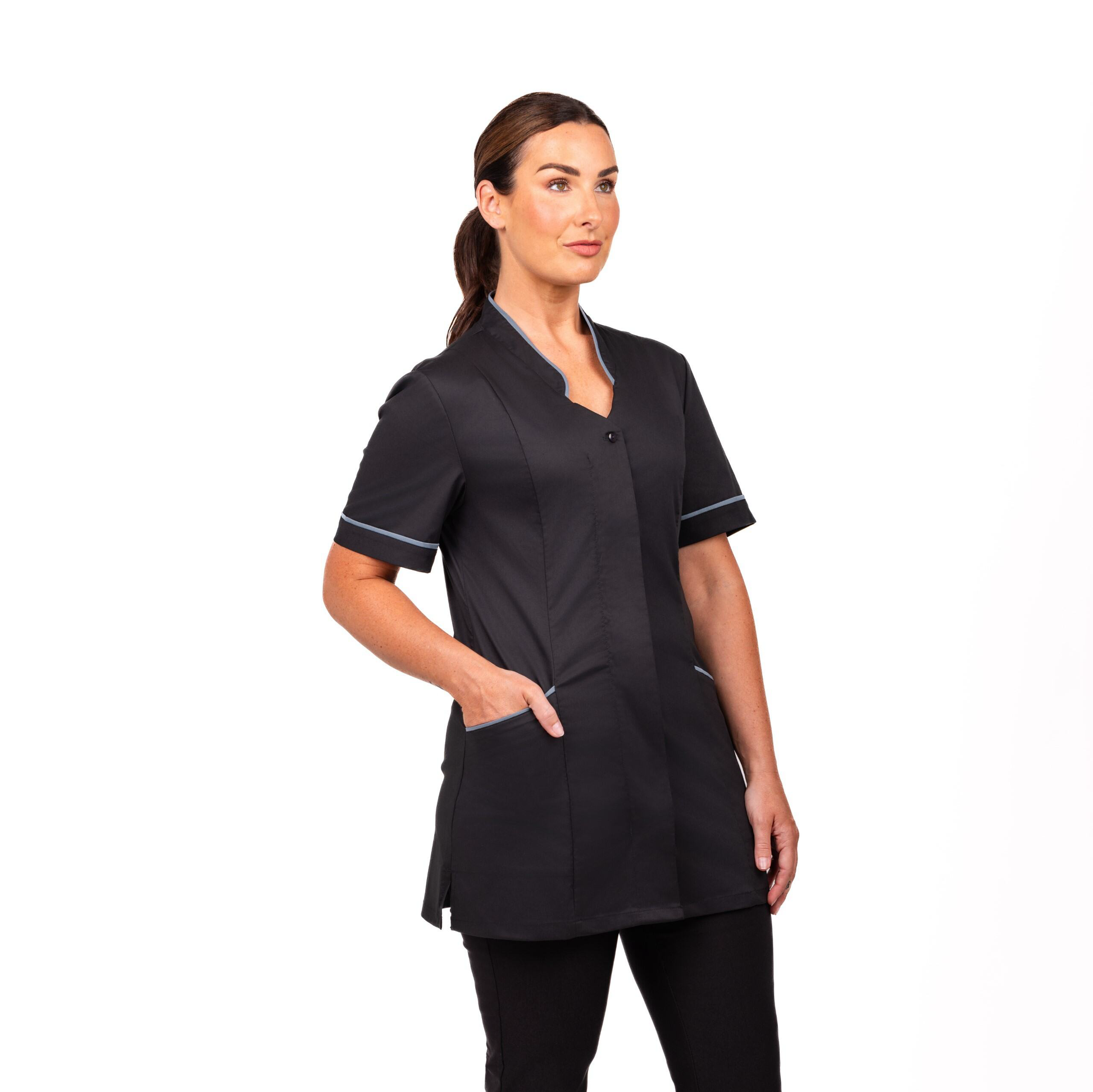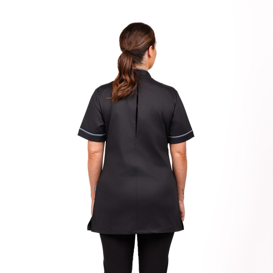 A sculpted neckline adds interest and sophistication to customer-facing teams in beauty and healthcare. Features include a concealed zip front with button closer, two hip pockets and trim detailing along pockets, sleeves and neckline. The action back and side seam splits provide added mobility.