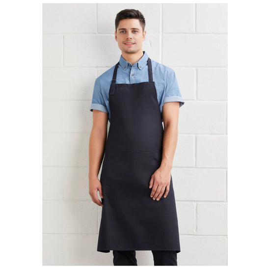 Bib apron with adjustable halter/self-fabric strap around the neck and towel loop at the back. A large central front pocket provides provision for a bottle opener and a special side slide pen. Unique styling with a free size of 86 cm x 70 cm. Made from 65% polyester and 35% cotton twill/190 GSM.
