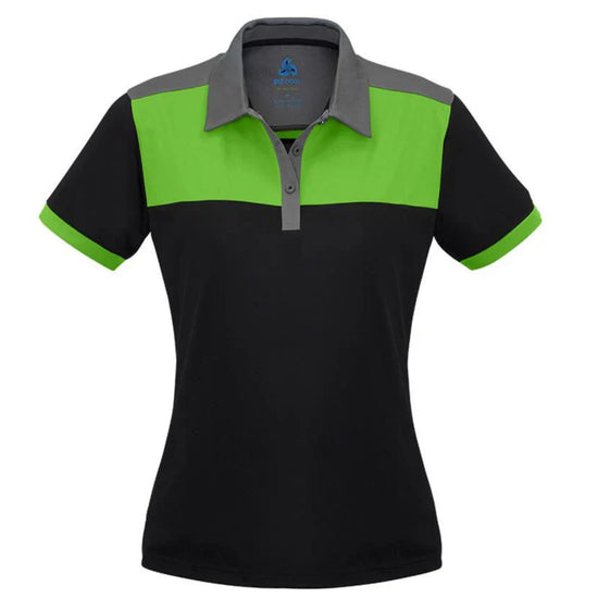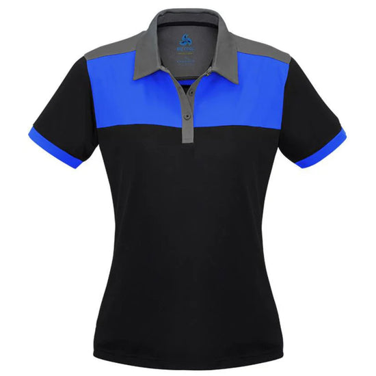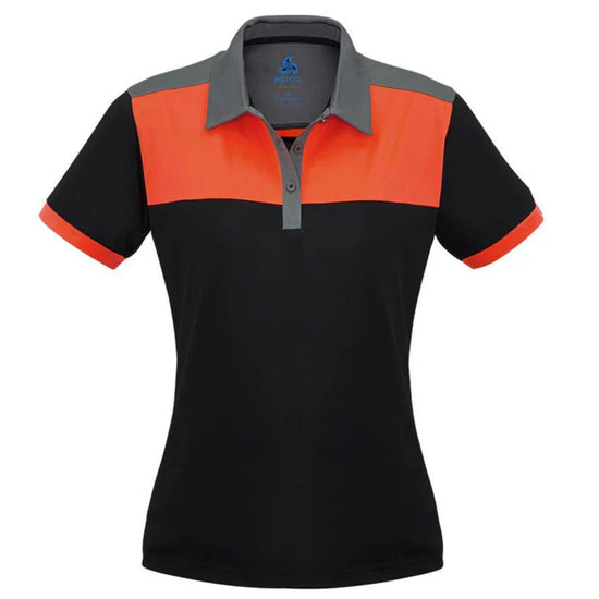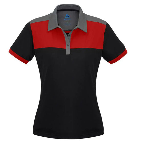 Ladies modern fit polo made from antibacterial treated fabric which resists odour and keeps you cool and fresh. Contrast panels/, self-fabric collar and sleeve cuff. 155 GSM. UPF rating – Excellent.