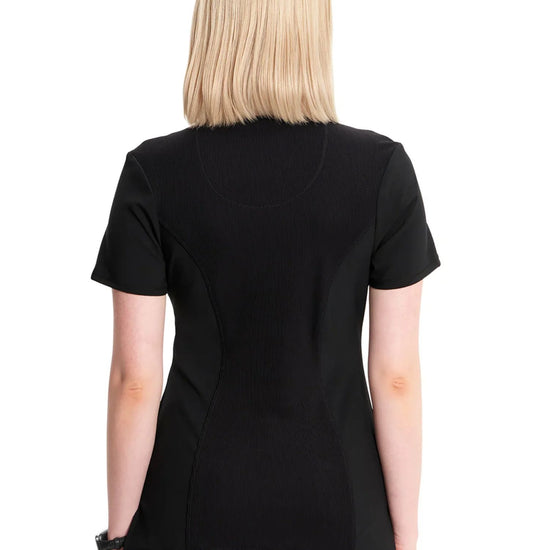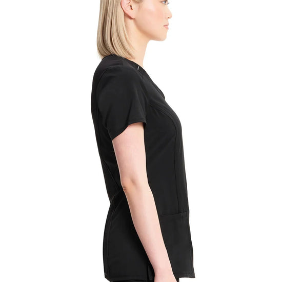 A Contemporary fit round neck top with a rib-knit inset at the front neckband also features shoulder yokes and a bungee I.D. badge loop on the right shoulder, front, and back princess seams, two patch pockets, one interior pocket, and side vents. The comfortable stretch poplin fabric and super stretchy rib knit are the perfect combo for healthcare professionals. Stretch rib knit at the centre back panel gives this top its slimming shape and allows for extra movement for comfort.
