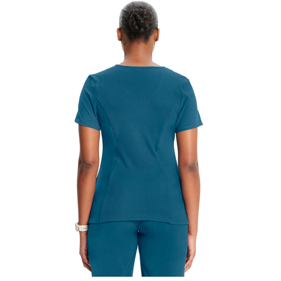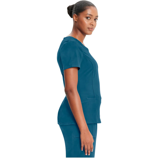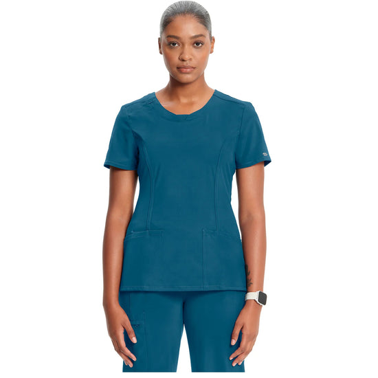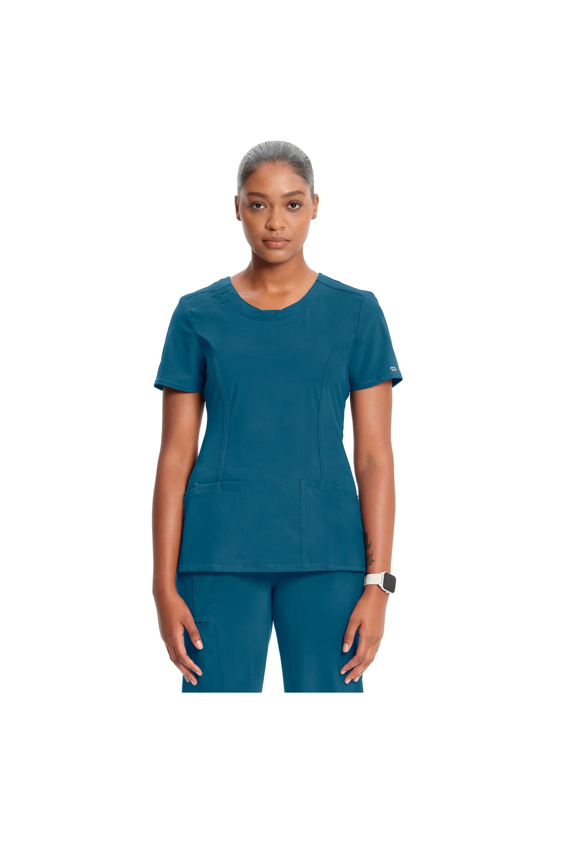 A Contemporary fit round neck top with a rib-knit inset at the front neckband also features shoulder yokes and a bungee I.D. badge loop on the right shoulder, front, and back princess seams, two patch pockets, one interior pocket, and side vents. The comfortable stretch poplin fabric and super stretchy rib knit are the perfect combo for healthcare professionals. Stretch rib knit at the centre back panel gives this top its slimming shape and allows for extra movement for comfort.