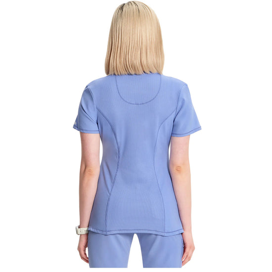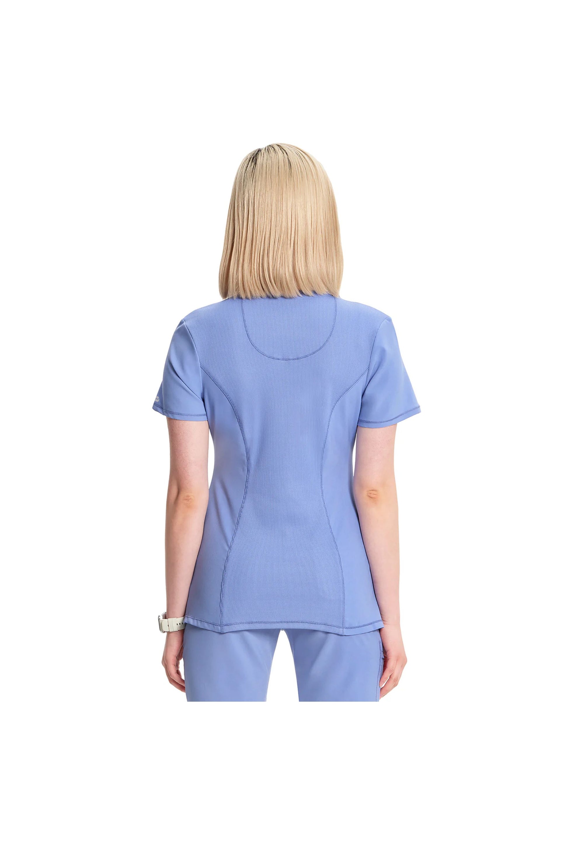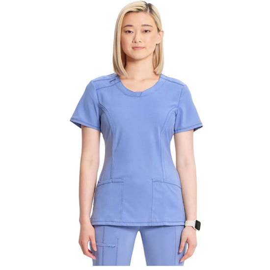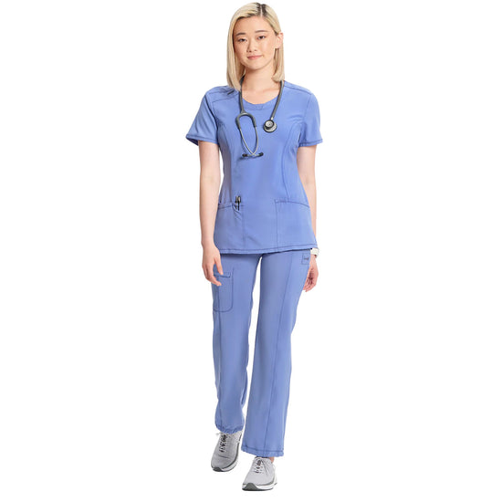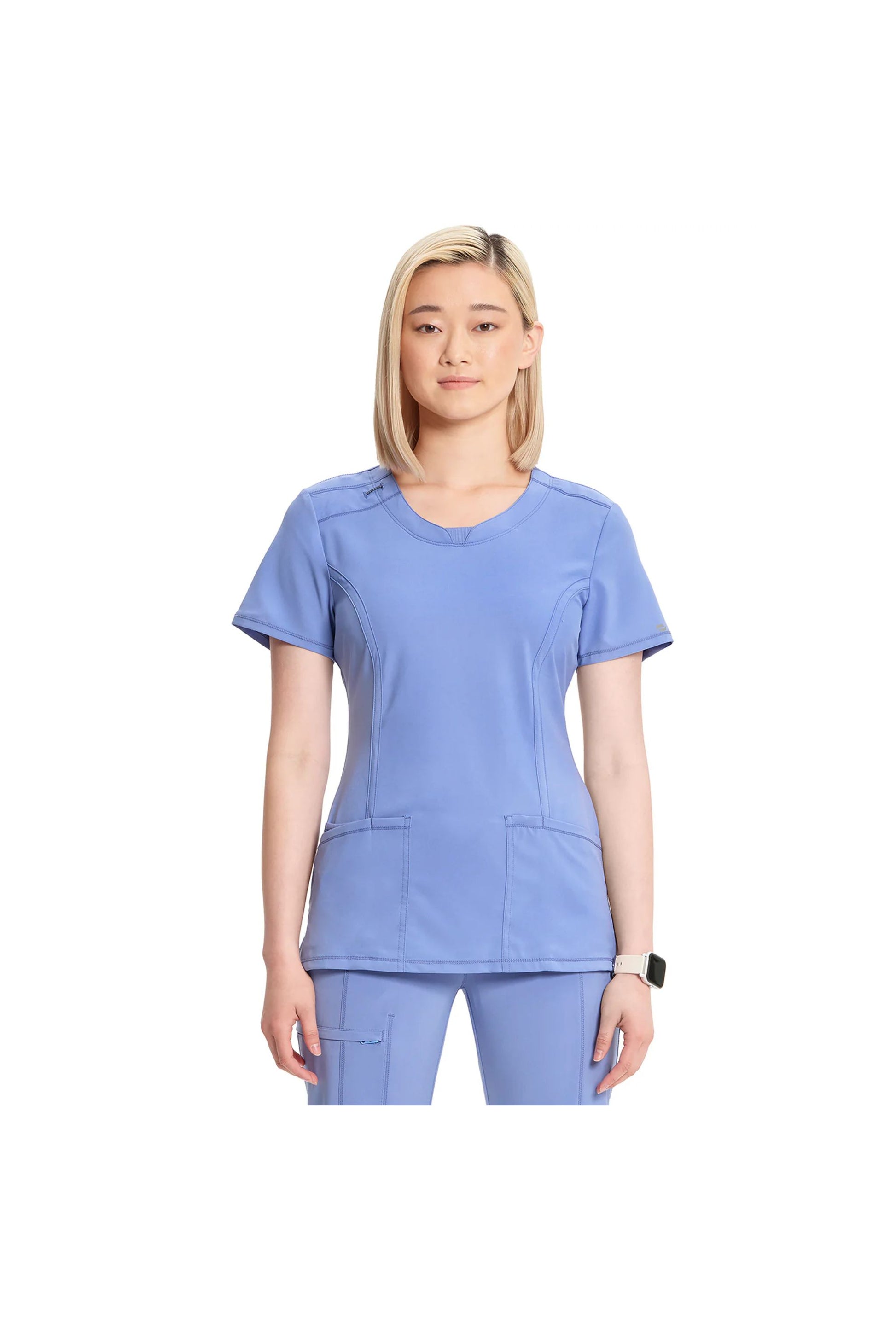A Contemporary fit round neck top with a rib-knit inset at the front neckband also features shoulder yokes and a bungee I.D. badge loop on the right shoulder, front, and back princess seams, two patch pockets, one interior pocket, and side vents. The comfortable stretch poplin fabric and super stretchy rib knit are the perfect combo for healthcare professionals. Stretch rib knit at the centre back panel gives this top its slimming shape and allows for extra movement for comfort.