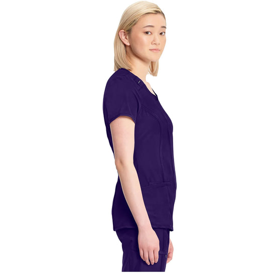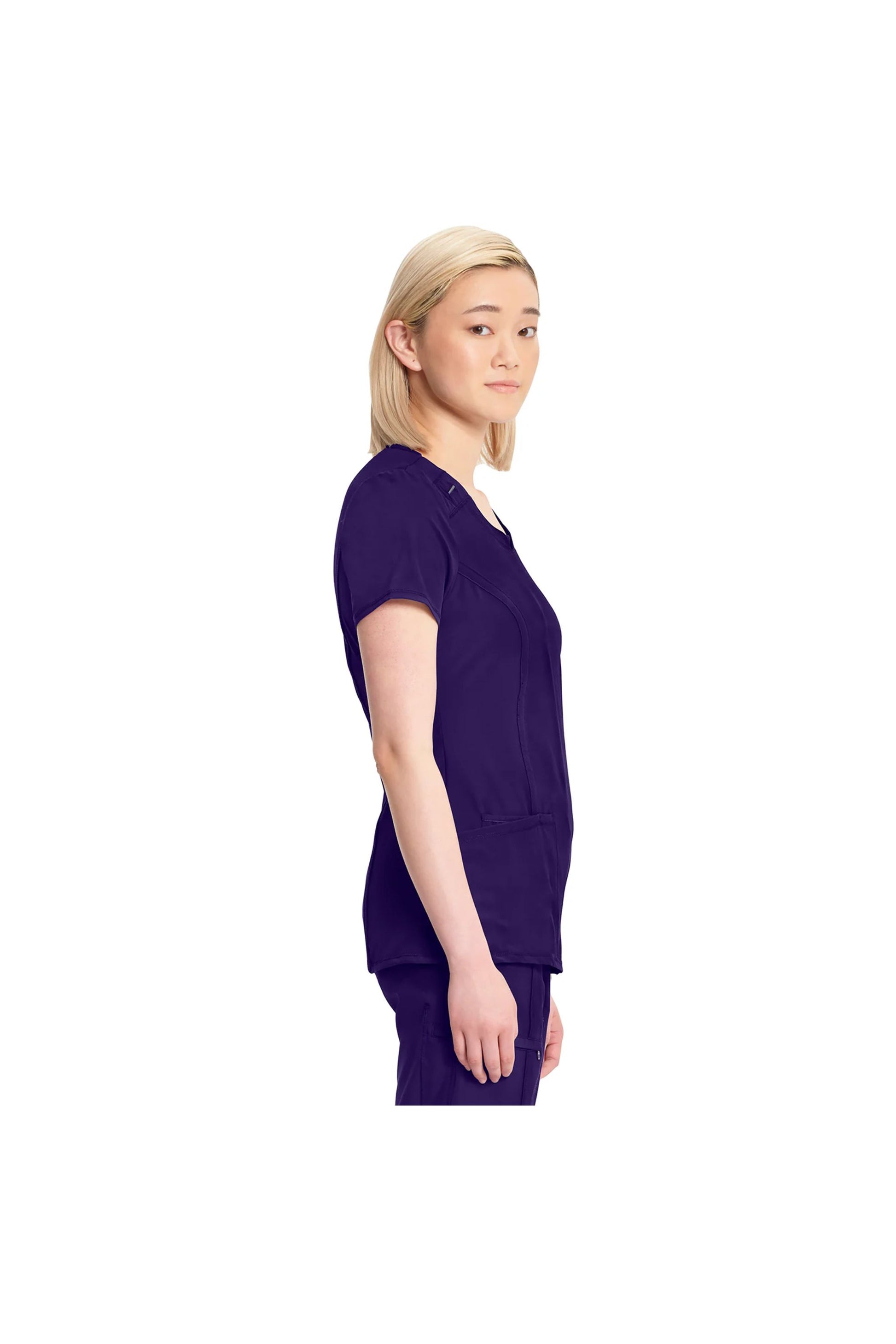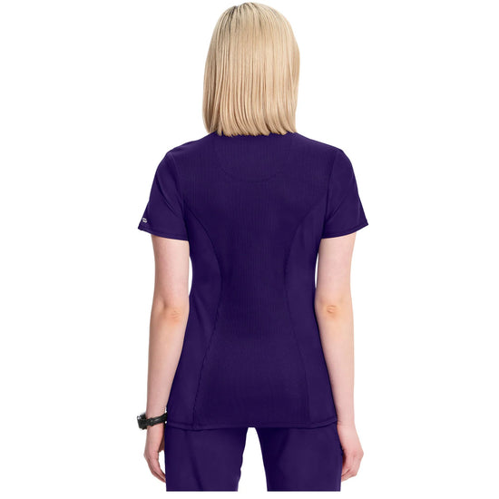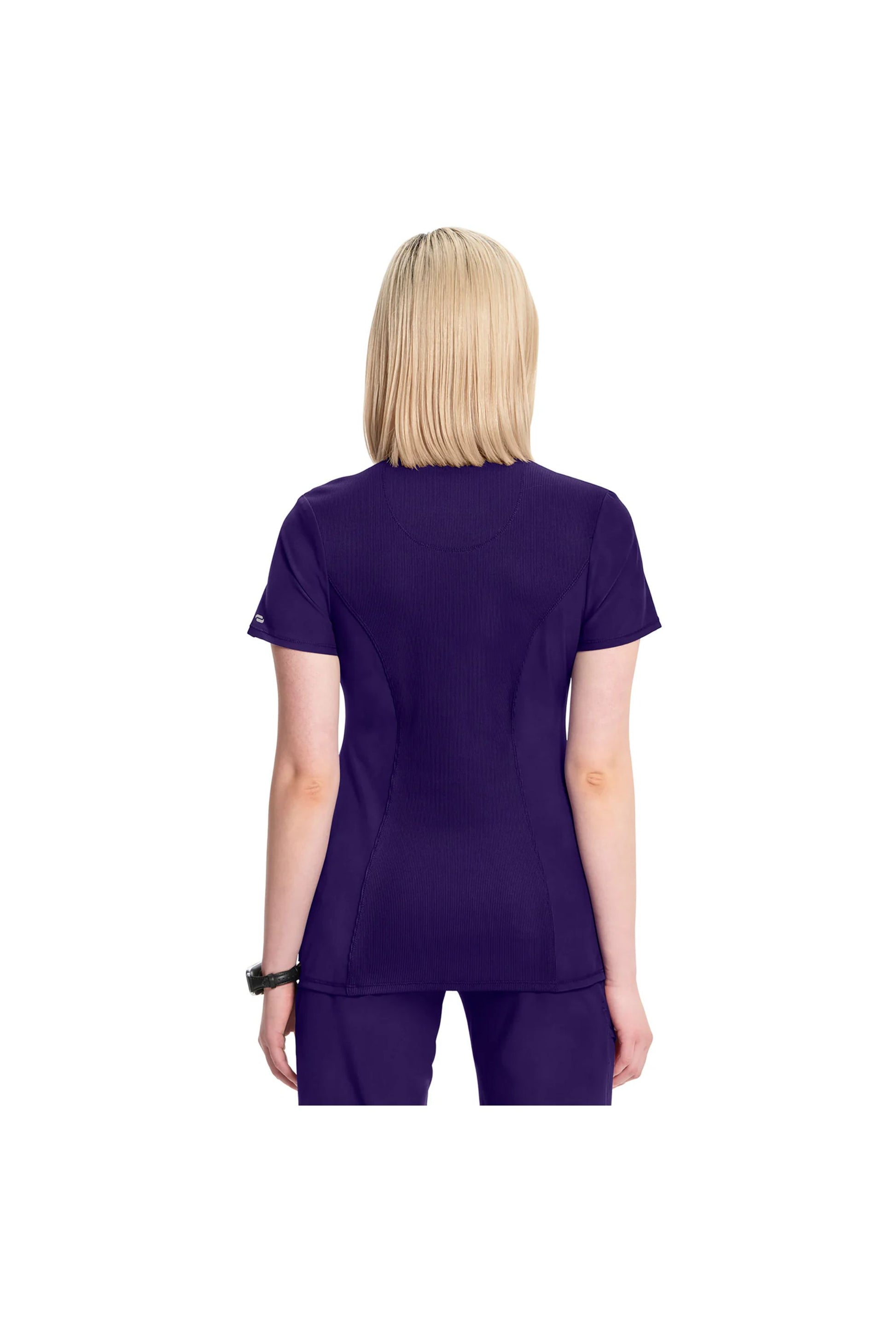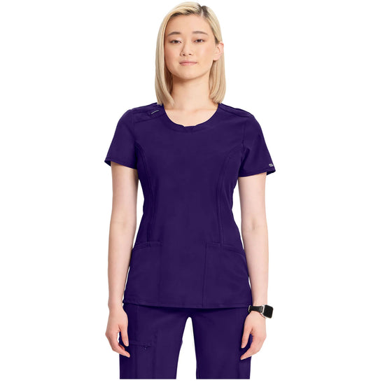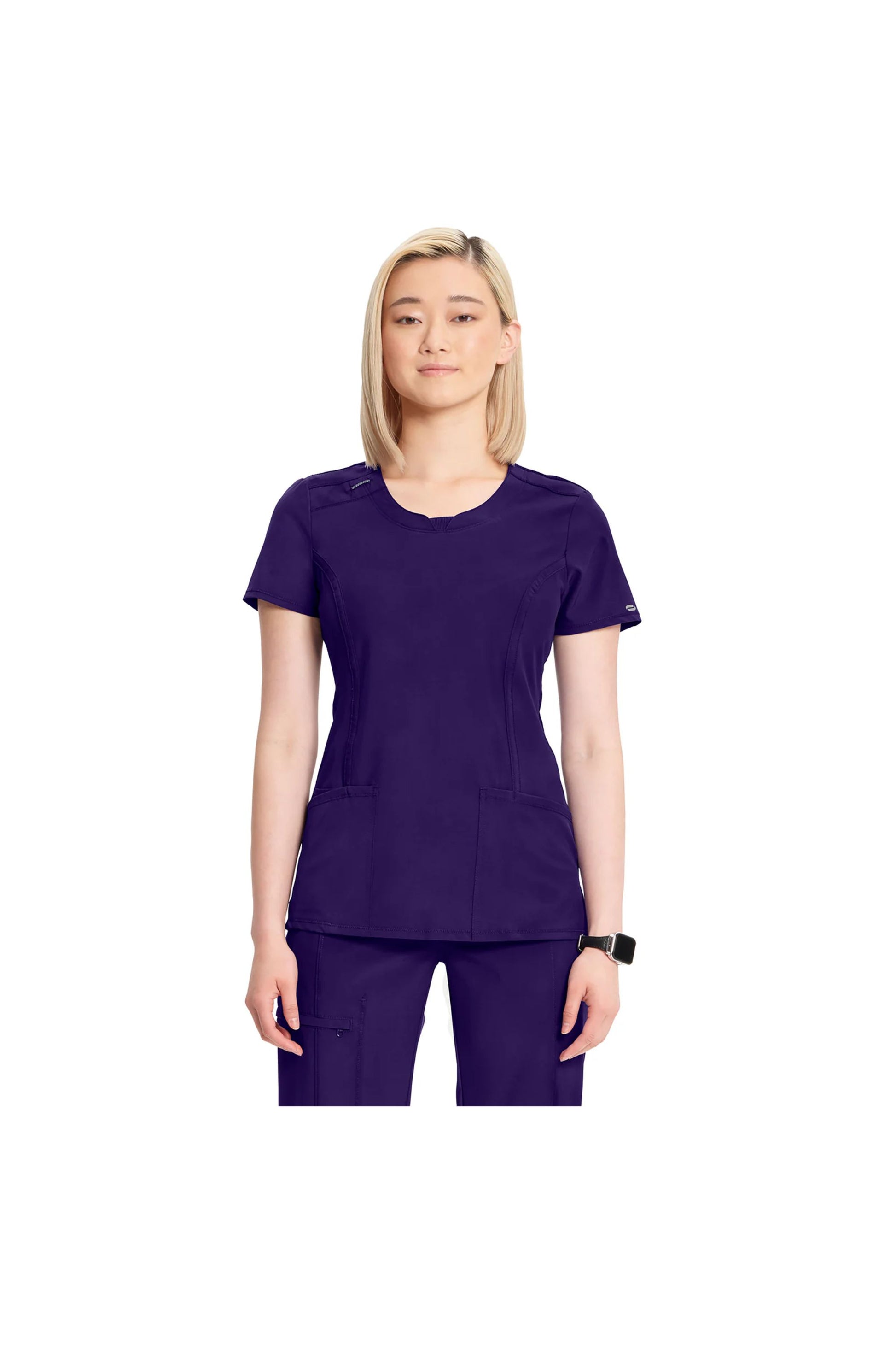 A Contemporary fit round neck top with a rib-knit inset at the front neckband also features shoulder yokes and a bungee I.D. badge loop on the right shoulder, front, and back princess seams, two patch pockets, one interior pocket, and side vents. The comfortable stretch poplin fabric and super stretchy rib knit are the perfect combo for healthcare professionals. Stretch rib knit at the centre back panel gives this top its slimming shape and allows for extra movement for comfort.