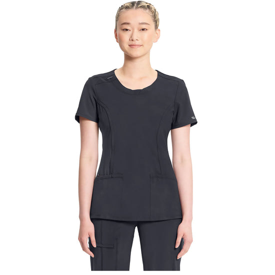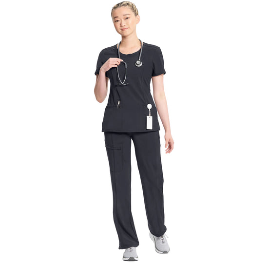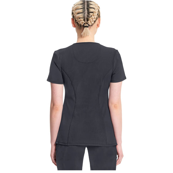 A Contemporary fit round neck top with a rib-knit inset at the front neckband also featured are shoulder yokes and a bungee I.D. badge loop on the right shoulder, front and back princess seams, two patch pockets, one interior pocket, and side vents. The comfortable stretch poplin fabric and super stretchy rib knit are the perfect combo for healthcare professionals. Stretch rib knit at the centre back panel gives this top its slimming shape and allows for extra movement for comfort.