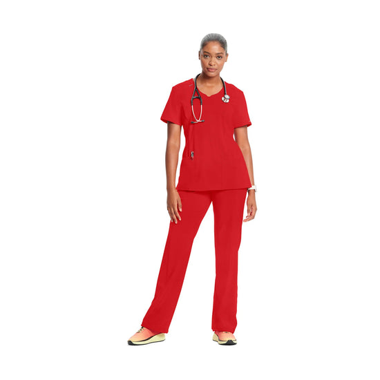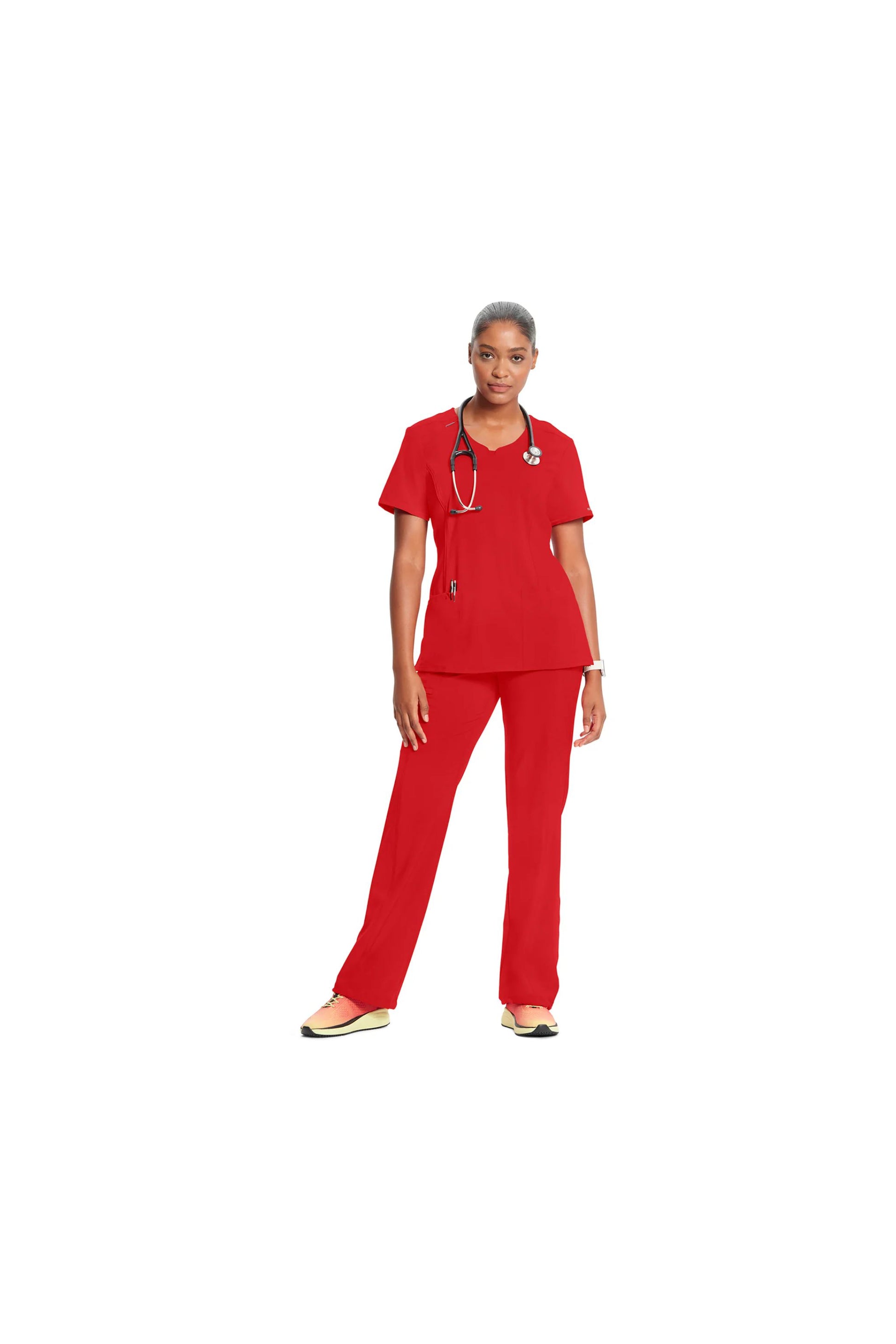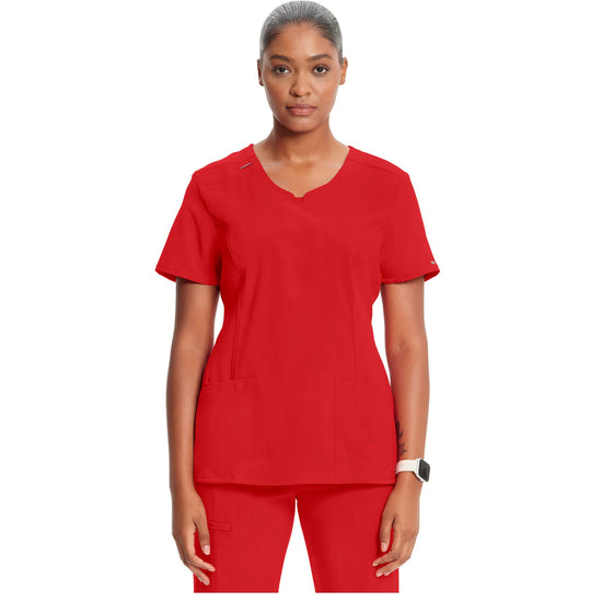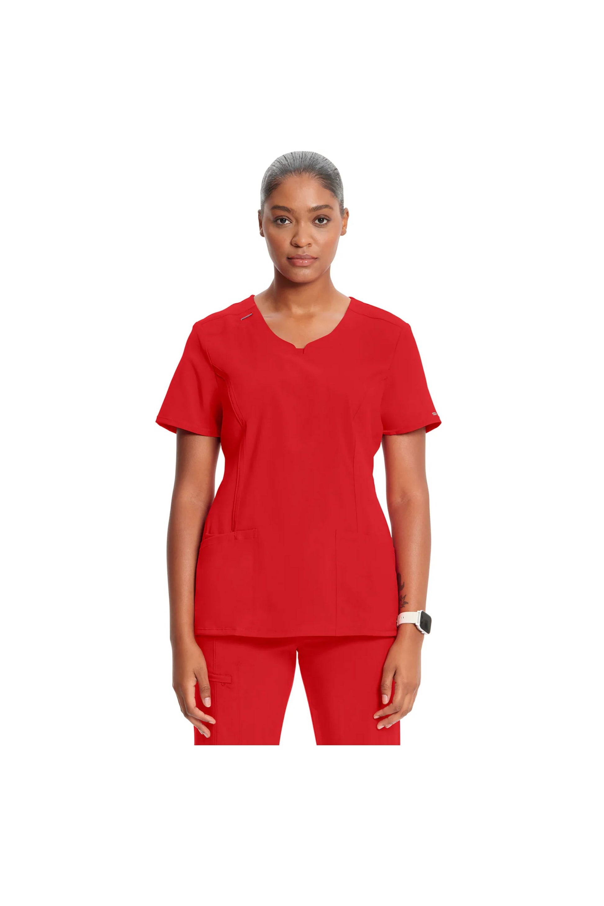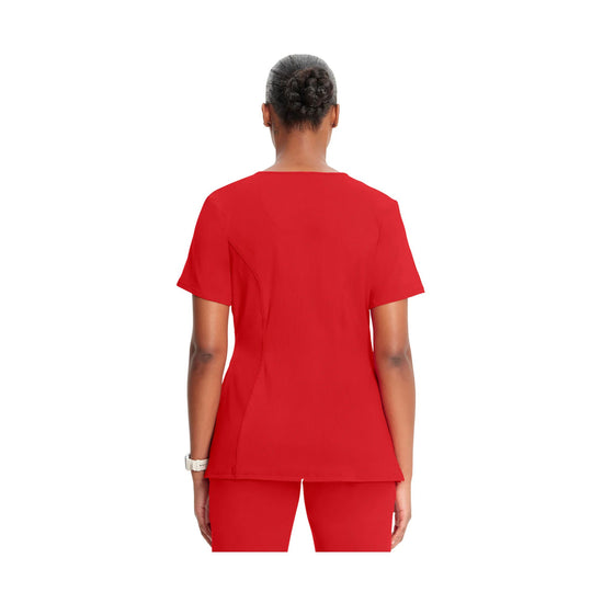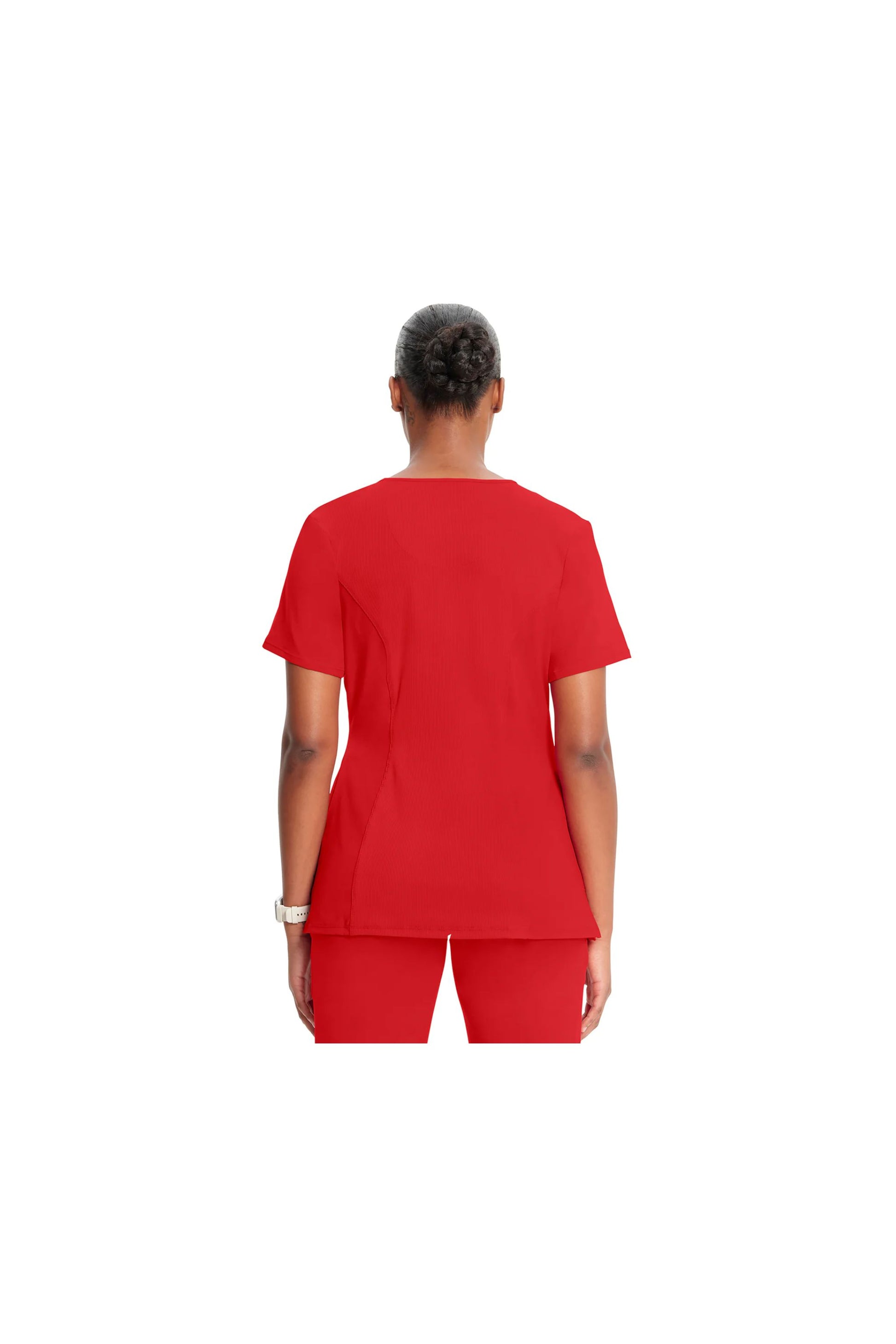 A Contemporary fit round neck top with a rib-knit inset at the front neckband also featured are shoulder yokes and a bungee I.D. badge loop on the right shoulder, front and back princess seams, two patch pockets, one interior pocket, and side vents. The comfortable stretch poplin fabric and super stretchy rib knit are the perfect combo for healthcare professionals. Stretch rib knit at the centre back panel gives this top its slimming shape and allows for extra movement for comfort.