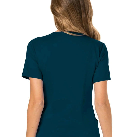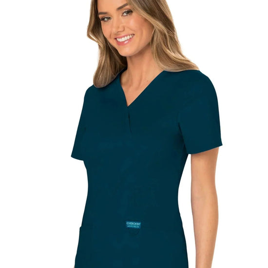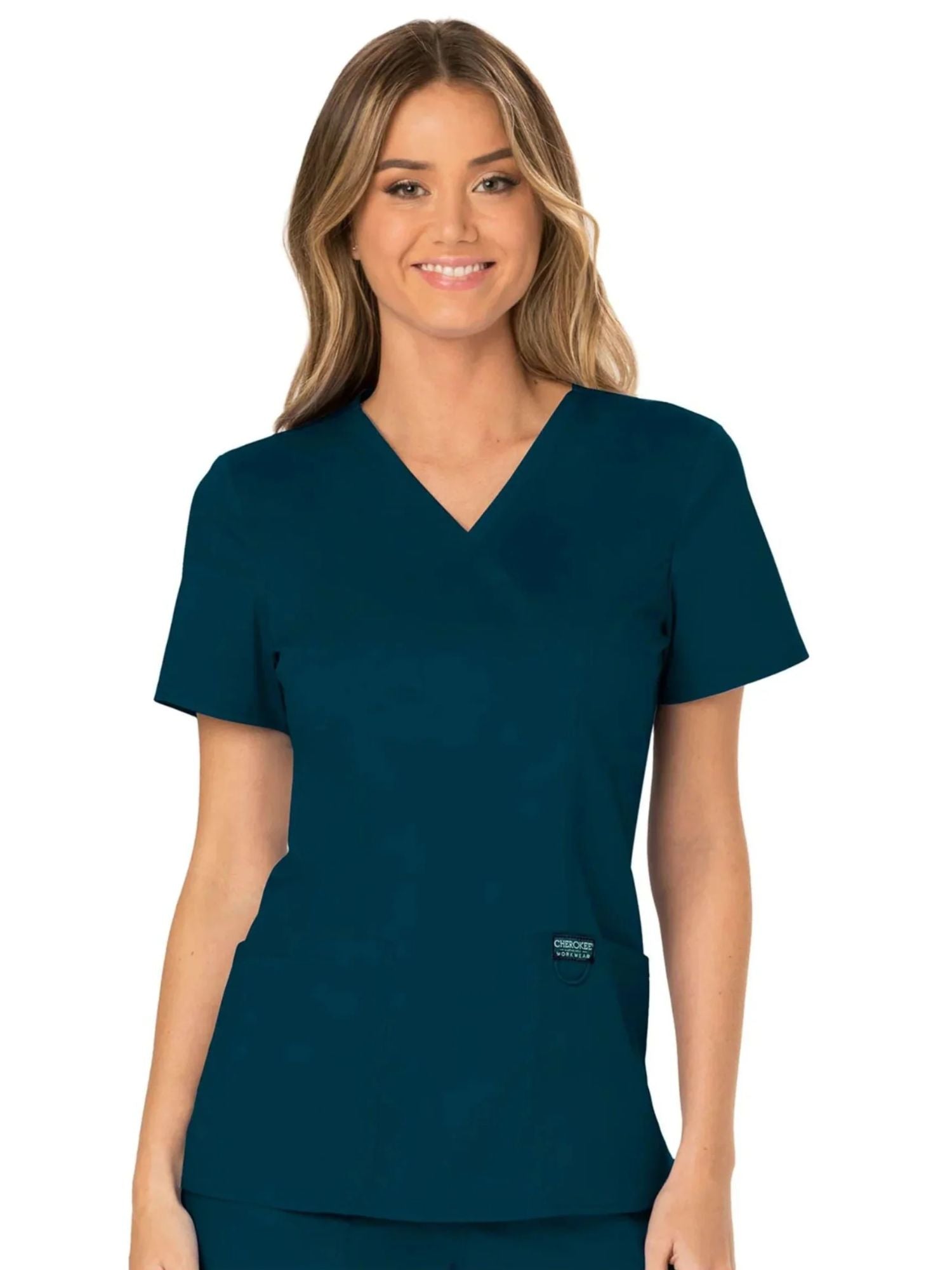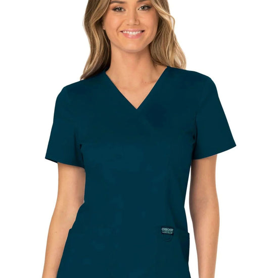 A modern classic fit mock wrap top designed using Cherokee's renowned fabric and style. Featuring front shoulder yokes, two patch pockets, an instrument loop, a logo label with a bungee loop, front and back princess seams, and side vents. This garment is ideal for the healthcare environment.
