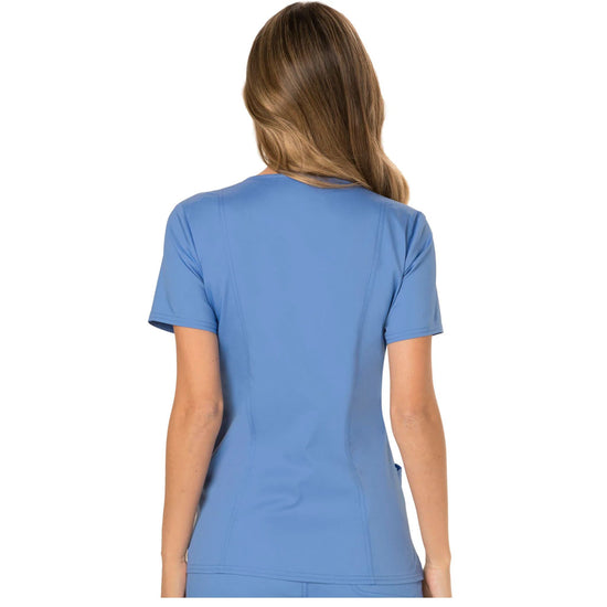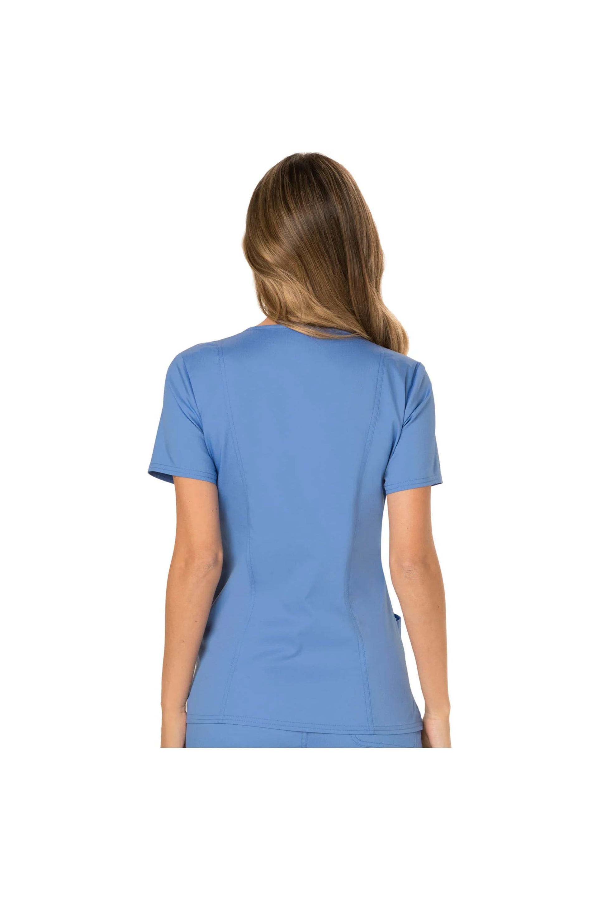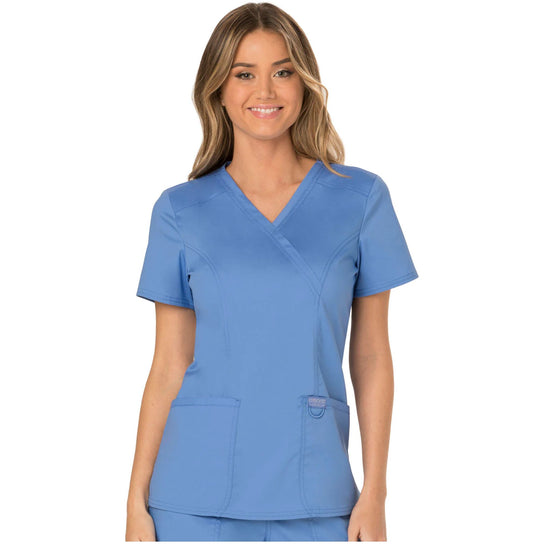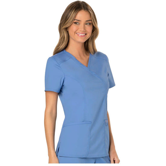 A Modern Classic fit Mock Wrap Top designed using Cherokee's renowned fabric and style. Featuring front shoulder yokes, two patch pockets, an instrument loop, a logo label with a bungee loop, front and back princess seams, and side vents. This garment is ideal for the healthcare environment.