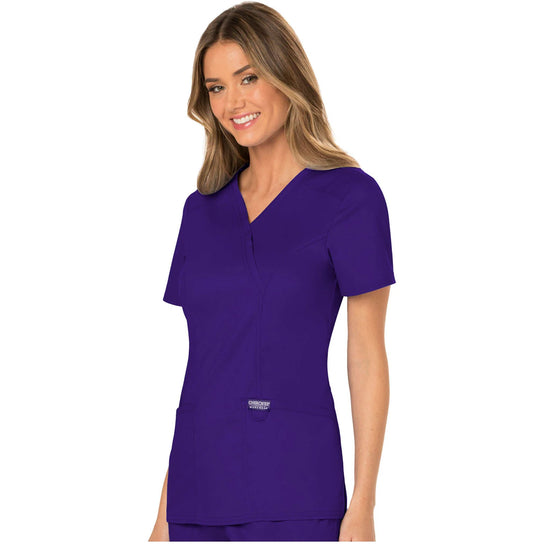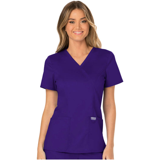 A Modern Classic fit Mock Wrap Top designed using Cherokee's renowned fabric and style. Featuring front shoulder yokes, two patch pockets, an instrument loop, a logo label with a bungee loop, front and back princess seams, and side vents. This garment is ideal for the healthcare environment.