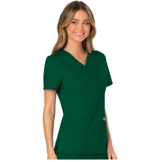 A Modern Classic fit Mock Wrap Top designed using Cherokee's renowned fabric and style. Featuring front shoulder yokes, two patch pockets, an instrument loop, a logo label with a bungee loop, front and back princess seams, and side vents. This garment is ideal for the healthcare environment.