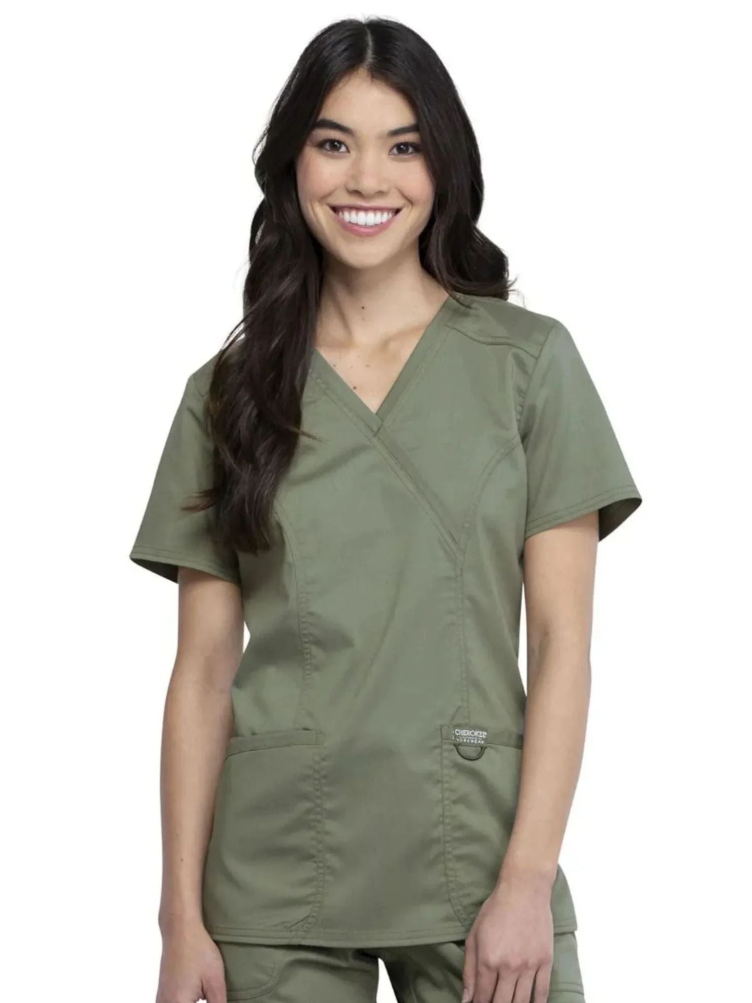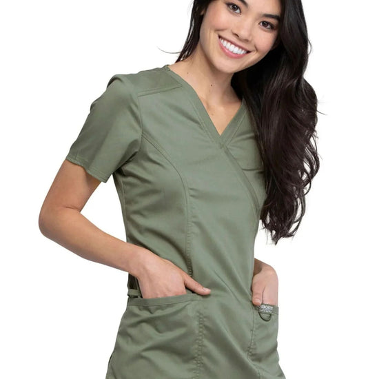 A modern classic fit mock wrap top designed using Cherokee's renowned fabric and style. Featuring front shoulder yokes, two patch pockets, an instrument loop, a logo label with a bungee loop, front and back princess seams, and side vents. This garment is ideal for the healthcare environment.