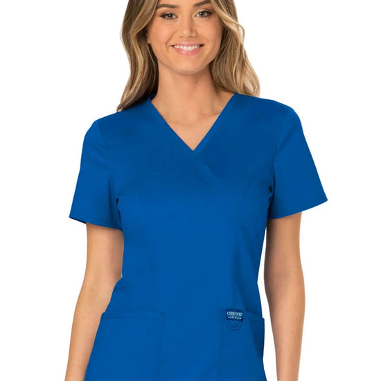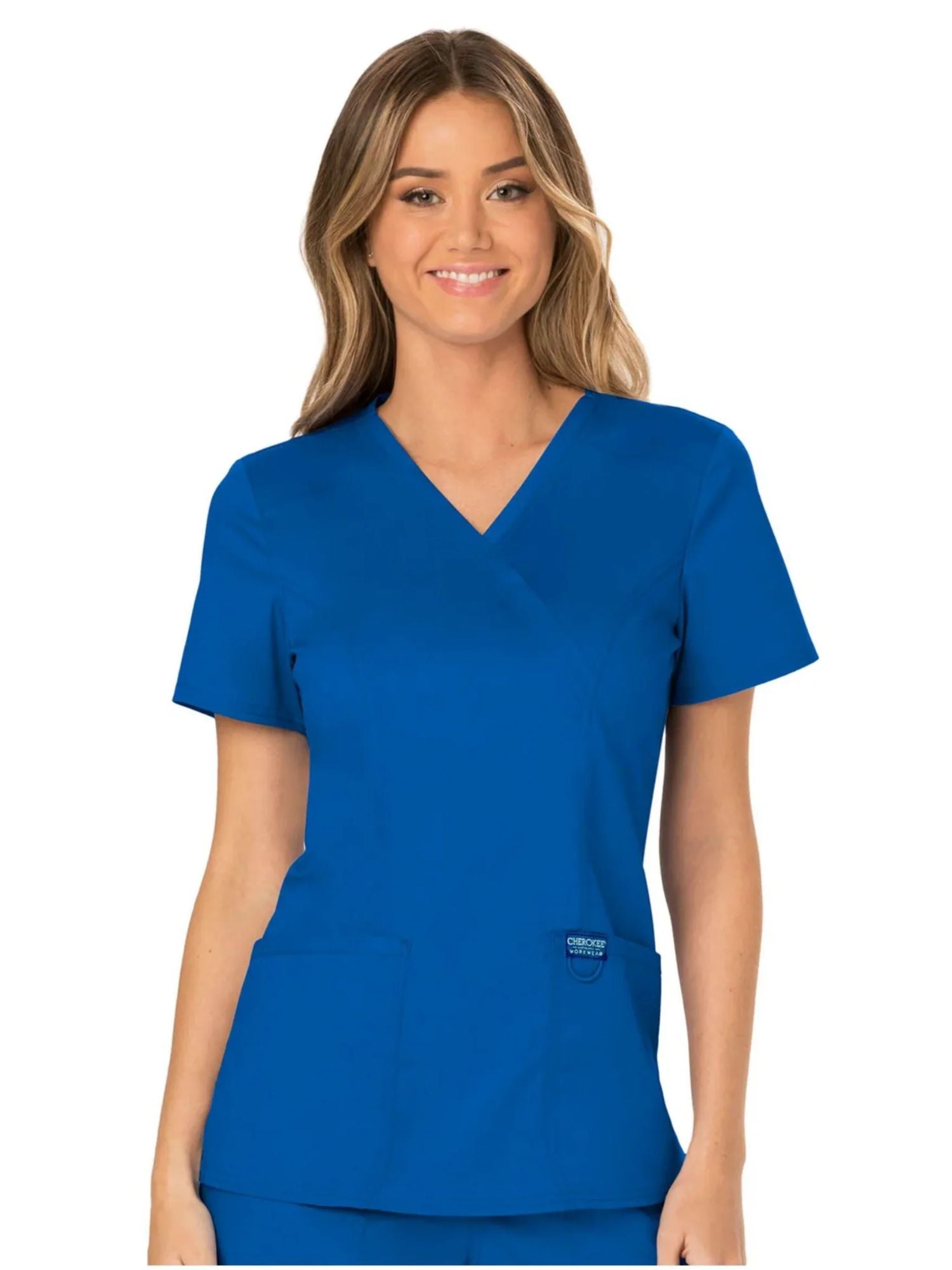 A modern classic fit mock wrap top designed using Cherokee's renowned fabric and style. Featuring front shoulder yokes, two patch pockets, an instrument loop, a logo label with a bungee loop, front and back princess seams, and side vents. This garment is ideal for the healthcare environment.