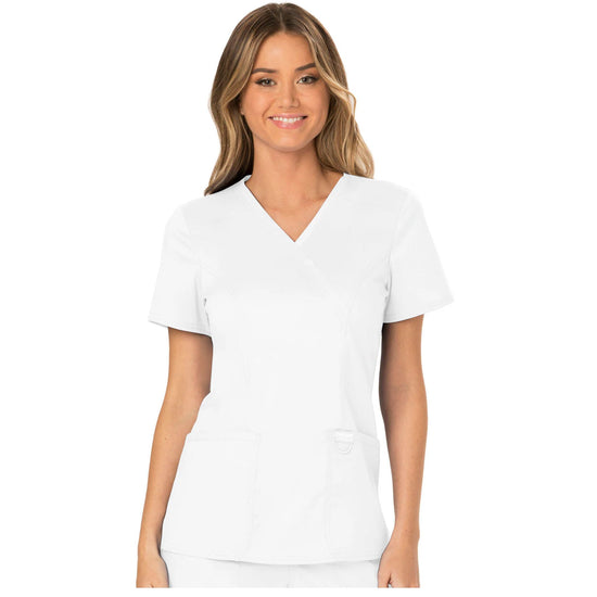 A Modern Classic fit Mock Wrap Top designed using Cherokee's renowned fabric and style. Featuring front shoulder yokes, two patch pockets, an instrument loop, a logo label with a bungee loop, front and back princess seams, and side vents. This garment is ideal for the healthcare environment.