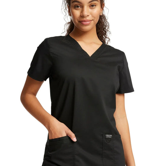The Cherokee Women's Revolution V-Neck Top is a classic fit. Featuring patch pockets, an instrument loop, pencil stitch, a logo label with a bungee loop, back princess seams, and side vents. Cherokee is renowned worldwide for its fabric and style, making this top a healthcare essential!