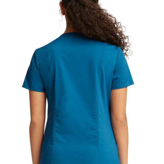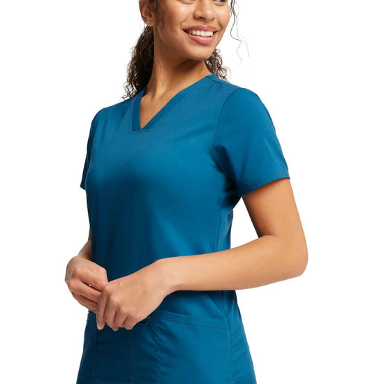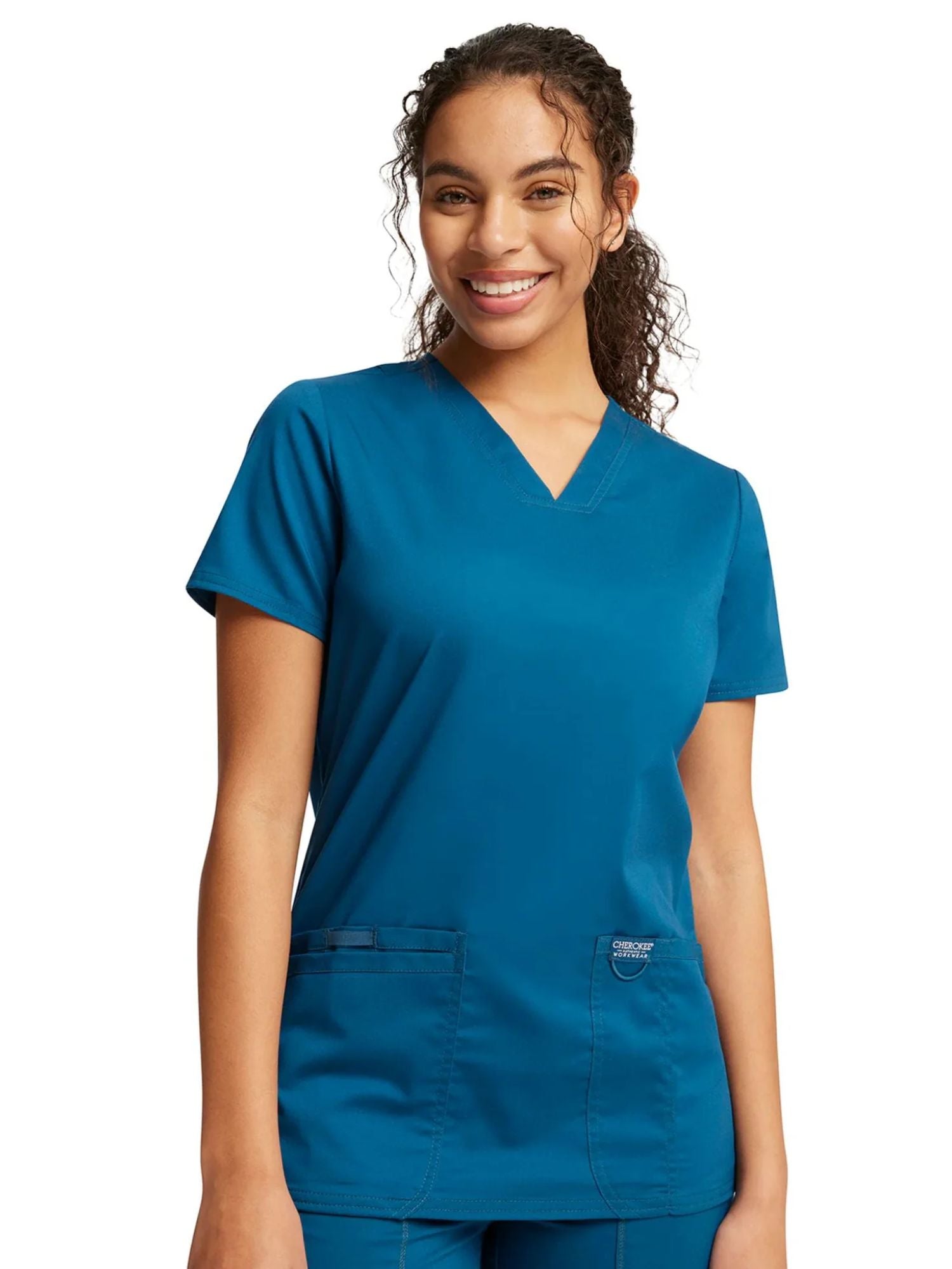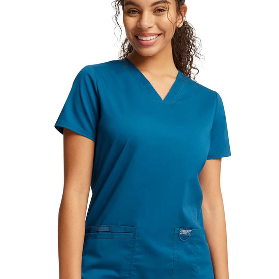 The Cherokee Women's Revolution V-Neck Top is a classic fit. Featuring patch pockets, an instrument loop, pencil stitch, a logo label with a bungee loop, back princess seams, and side vents. Cherokee is renowned worldwide for its fabric and style, making this top a healthcare essential!