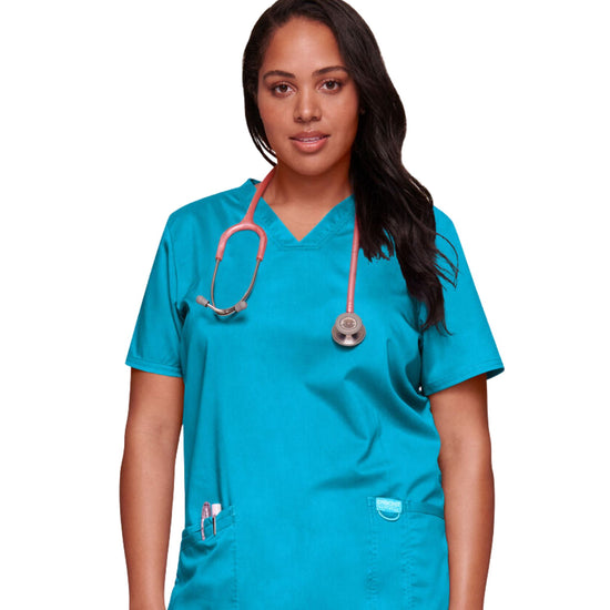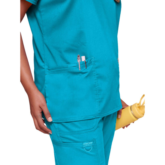 The Cherokee Women's Revolution V-Neck Top is a classic fit. Featuring patch pockets, an instrument loop, pencil stitch, logo label with bungee loop, back princess seams, and side vents. Cherokee is renowned worldwide for its fabric and style, making this top a healthcare essential!
