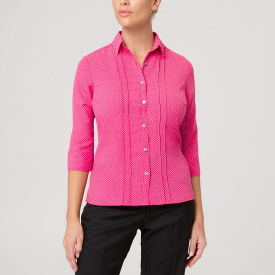 With delicate front pin tuck detailing and a fresh polka dot print, this blouse provides new interest to the functional blouse. This fabric has a natural stretch and two back vertical darts for movement. 3/4 sleeve with adjustable cuffs.