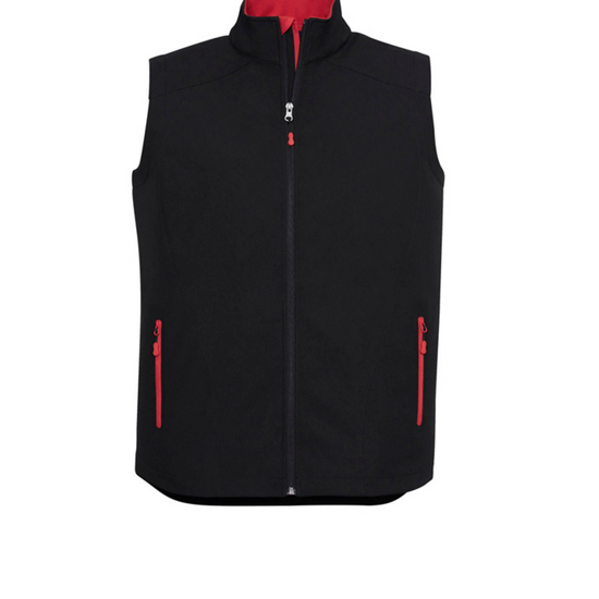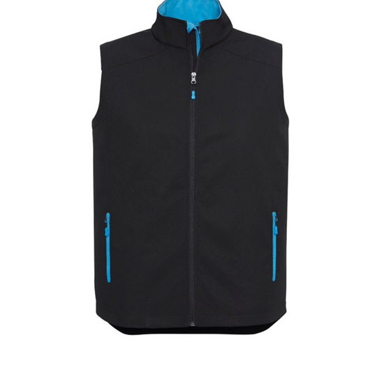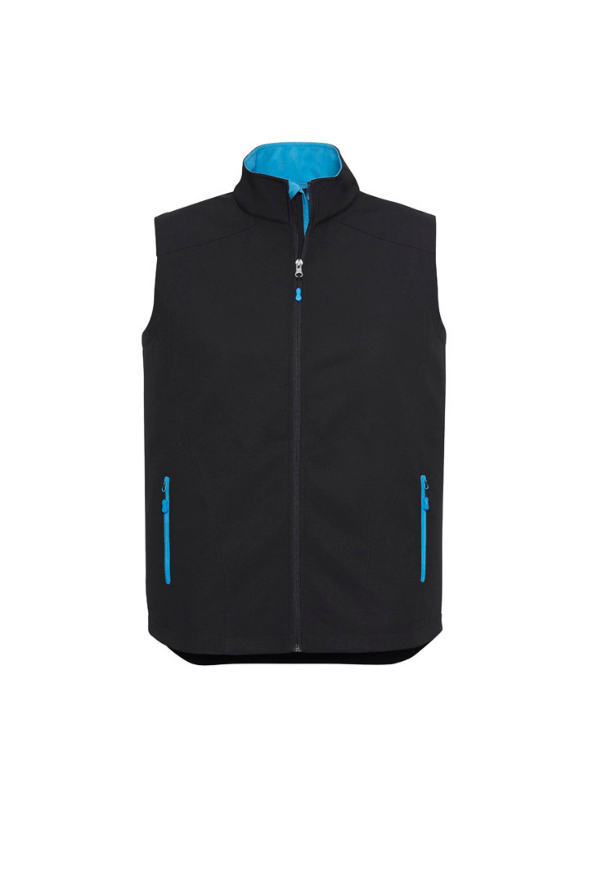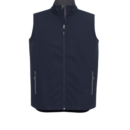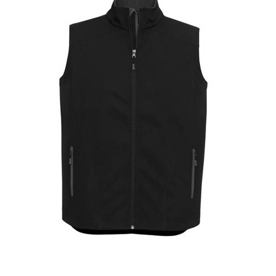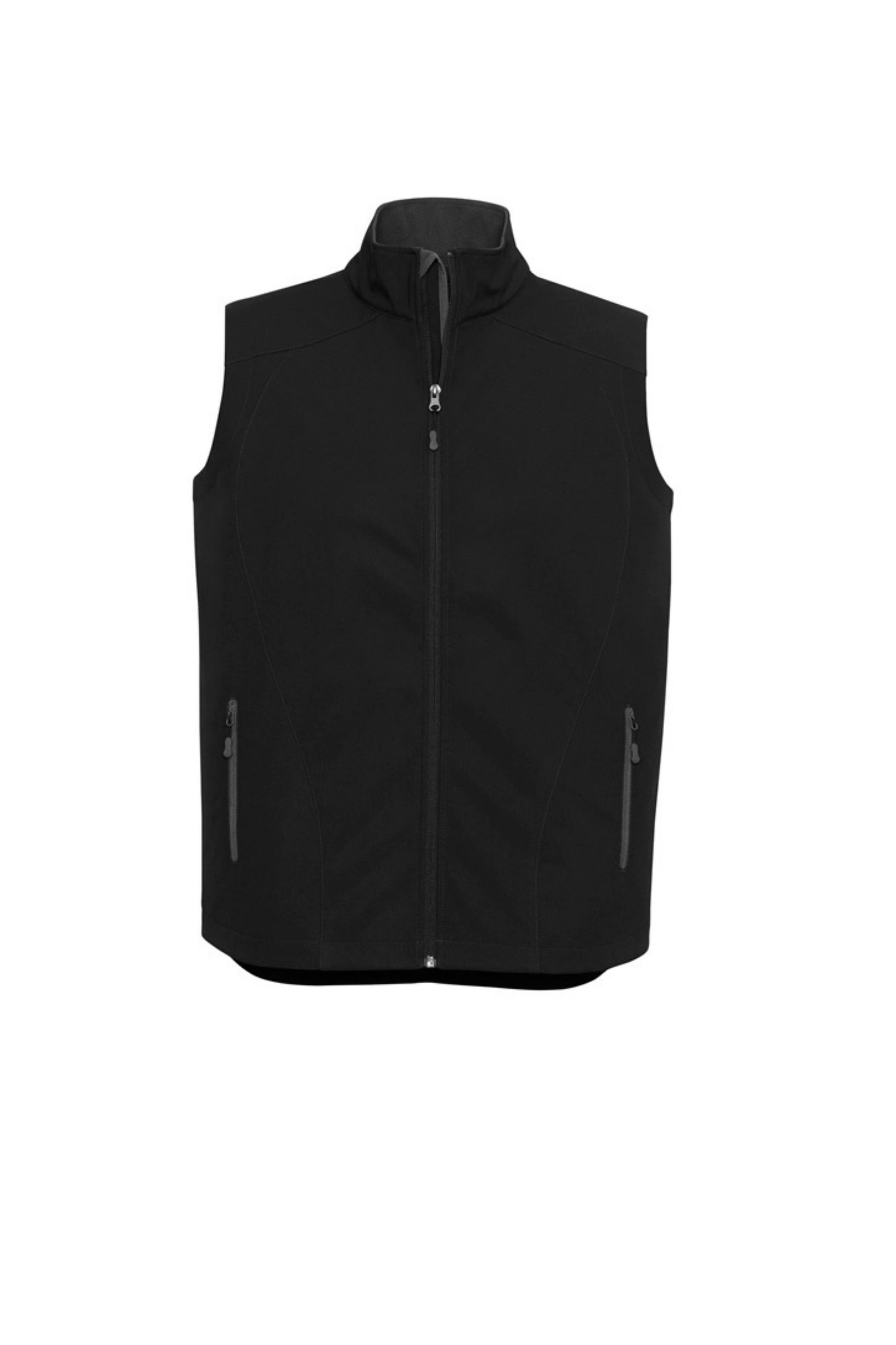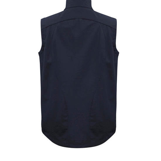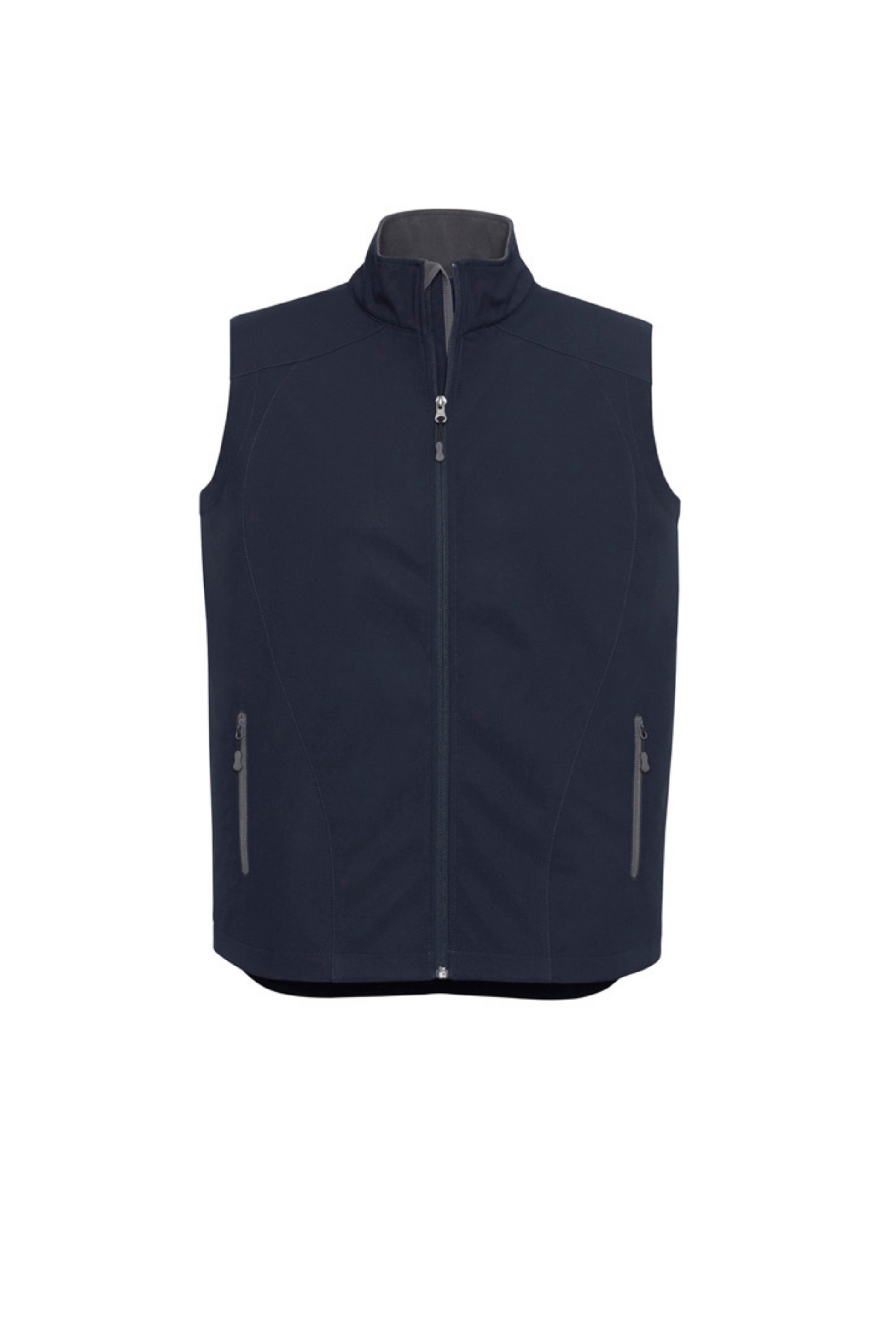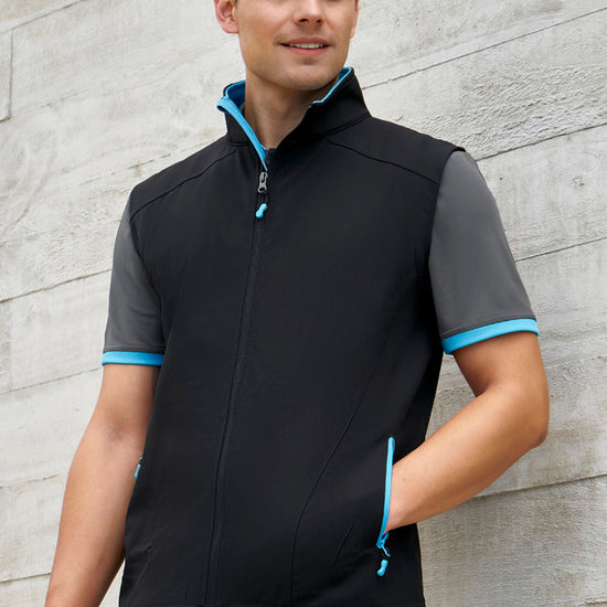 Mens windproof modern fit vest with bonded contrast textured mirco-ribbed fleece lining. Stand up collar with soft chin guard and contrast side zippered pockets with toggles. Scalloped longer back tail.