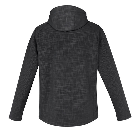 Subtle cross-hatch print adds an appealing design element that wont compete with your logo. Stretch bonded softshell for added comfort and movementwith removable zip-off hood with adjustable drawcord. Zippered front and pockets with rubberized toggles.
