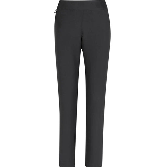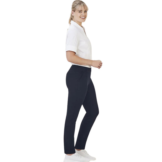 The perfect pull on stretch pant in a light weight fabric that is durable and comfortable. Suitable for all climates and quick drying. Easy care, wash and wear pant. Perfect for both functional and office roles. Wide basque waistband, with anti-roll elastic, no zips or buttons, functional back pocket, and two deep front angled pockets with utility loop on right hand side.
