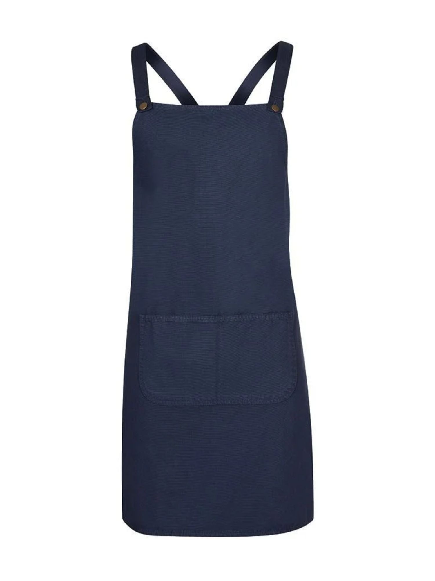 The cross-back canvas apron is fabricated from cotton for added comfort; it features a lower front sectioned hand pocket and luxe antique brass eyelets and shank buttons. The perfect modern-style canvas apron makes you and your staff look well presented while they serve.