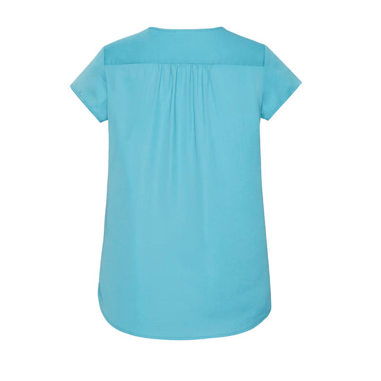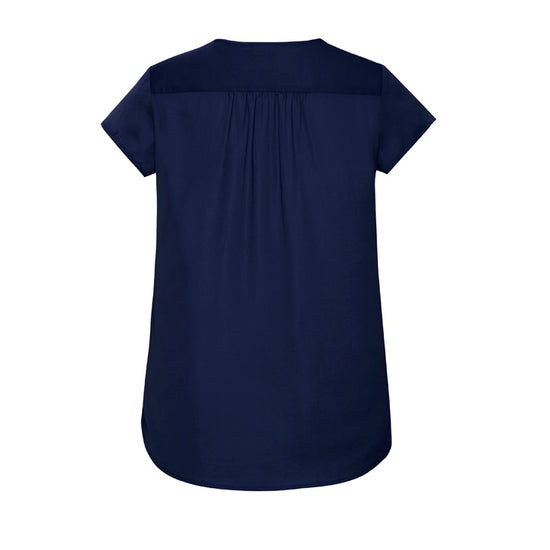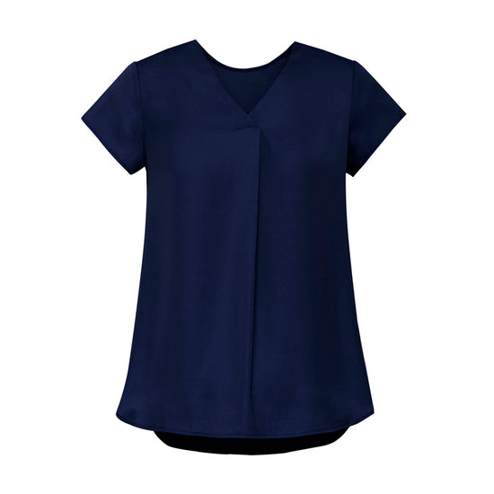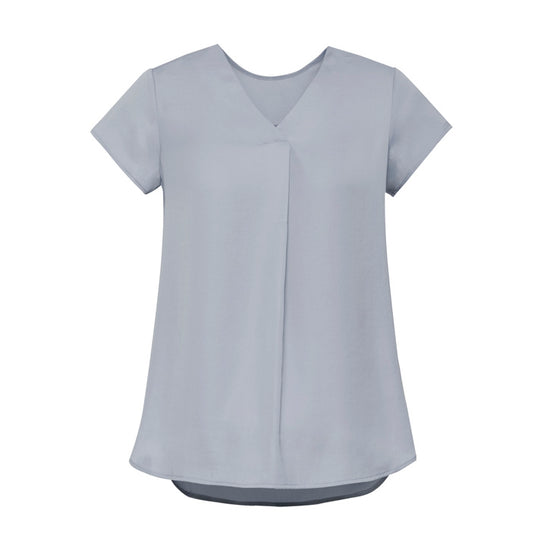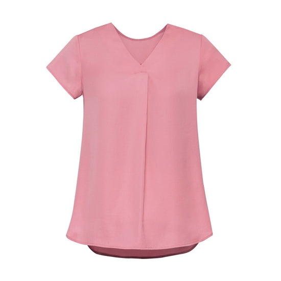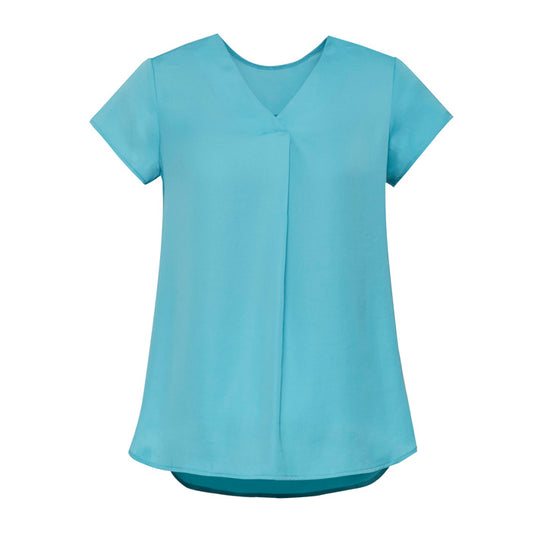 The Women's Kayla V-Neck Pleat Blouse has a silk-like hand feel with a hint of lustre for added sophistication. High twist and high-density yarn ensures no static cling. It features cap sleeves, with front and back pleat detailing and a longer curved back. Perfect worn out with slim leg pants.