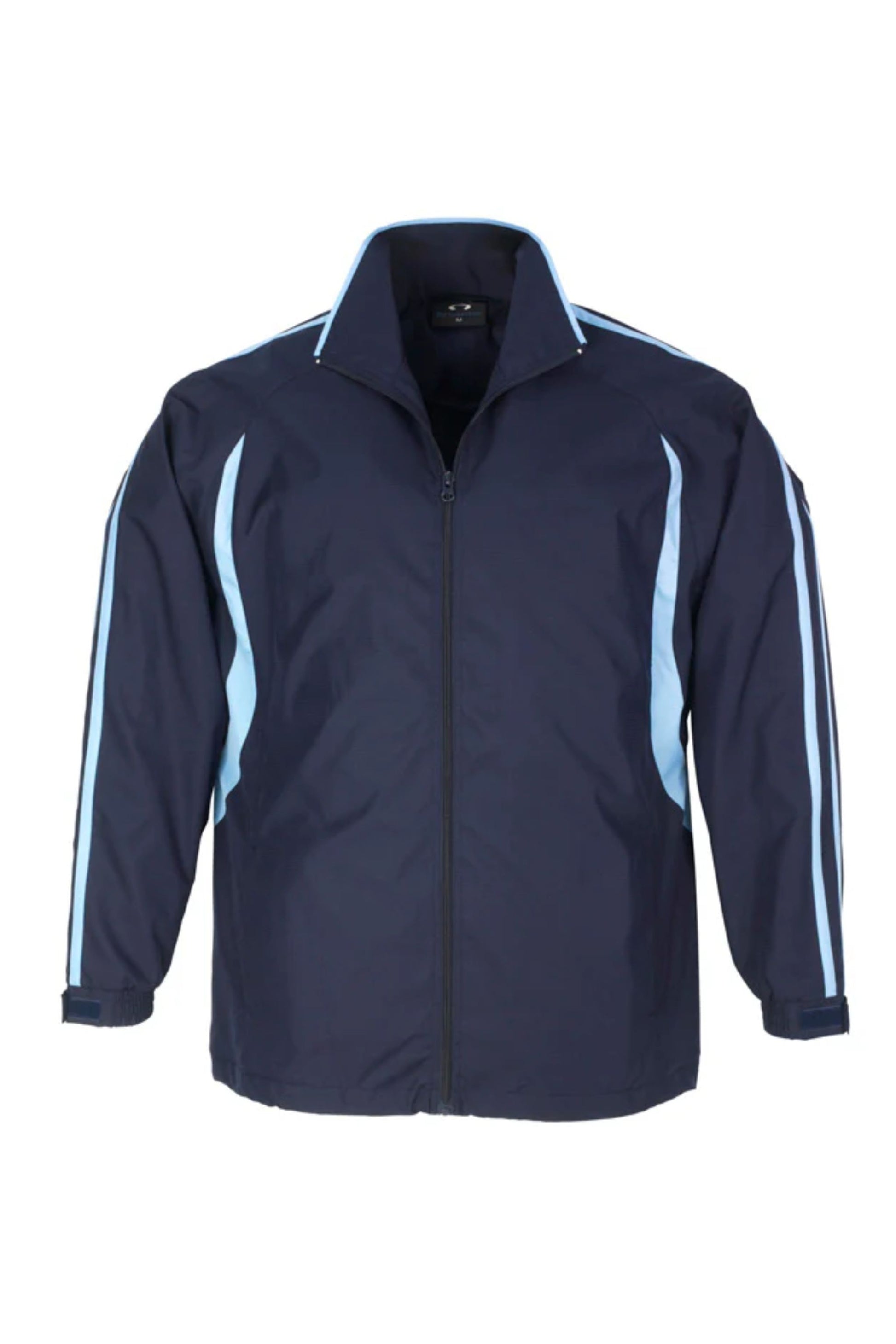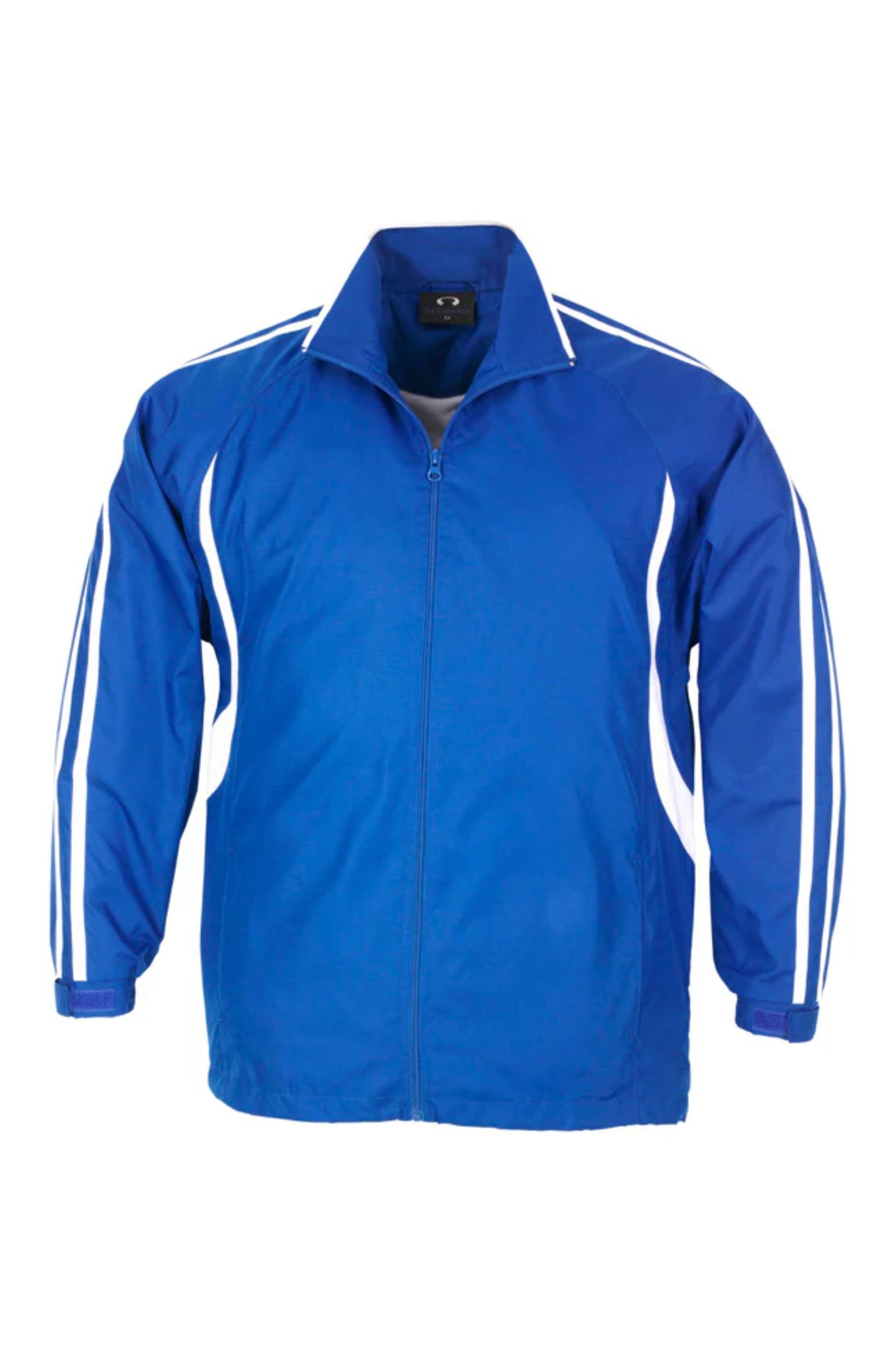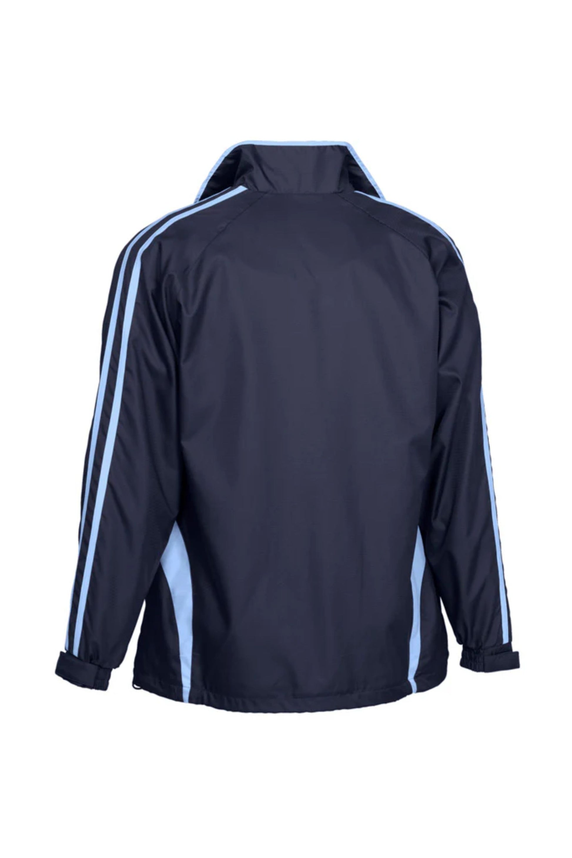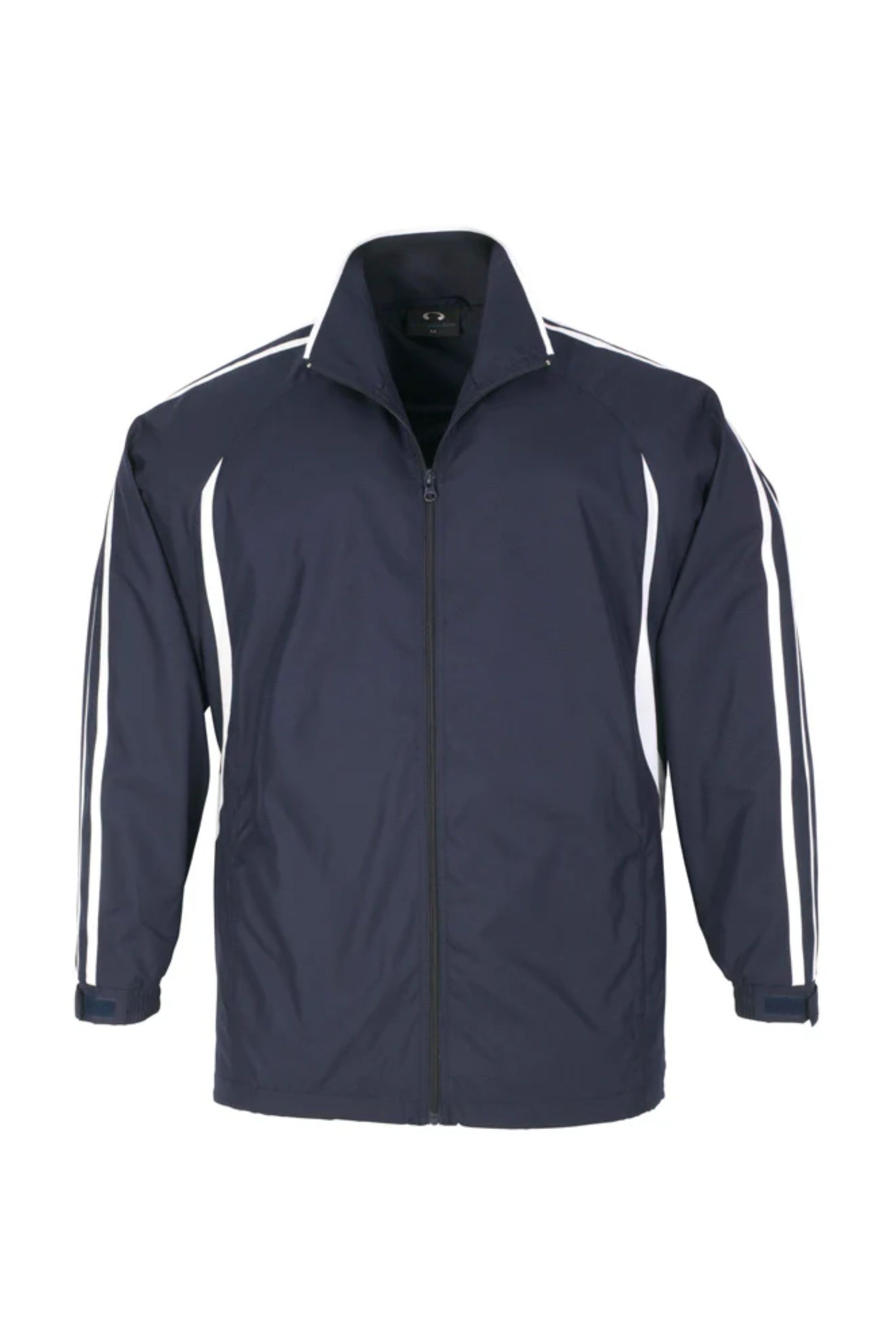 Unisex style lightweight jacket with full zip front and two side zippered pockets. Raglan sleeve with contrast colour flash splice and twin stripe detail. 100% Microfibre Ripstop outer with single jersey lined body for warmth.