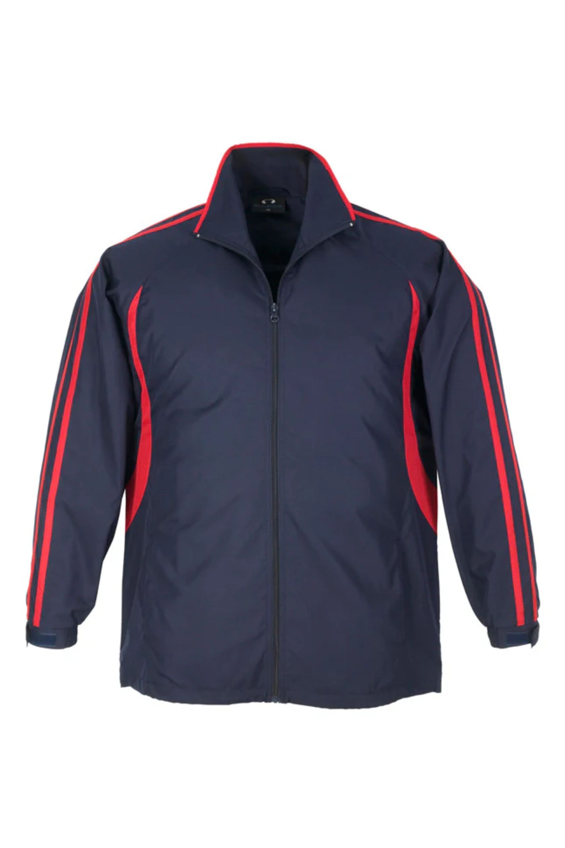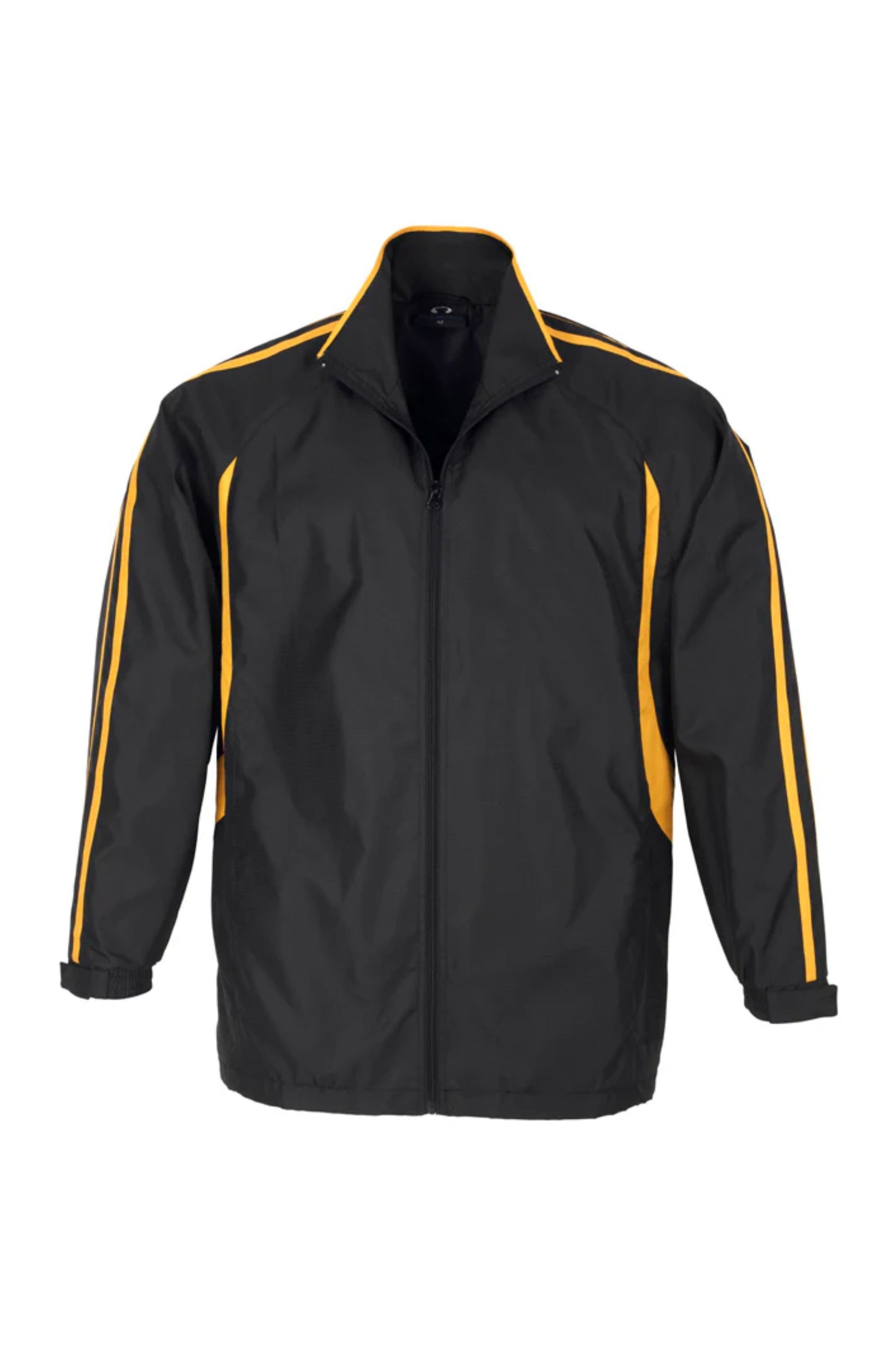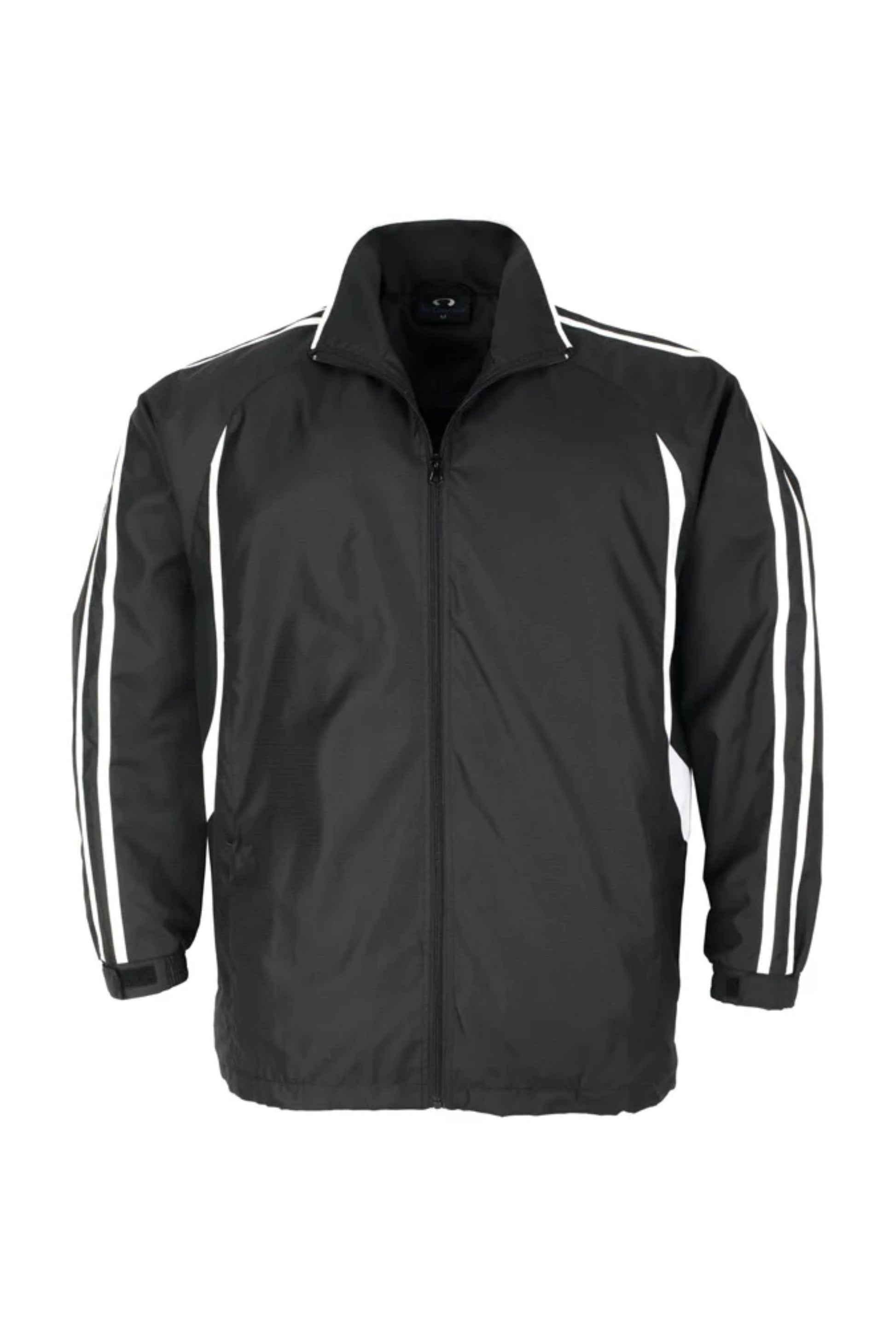 Unisex style lightweight jacket with full zip front and two side zippered pockets. Raglan sleeve with contrast colour flash splice and twin stripe detail. 100% Microfibre Ripstop outer with single jersey lined body for warmth.