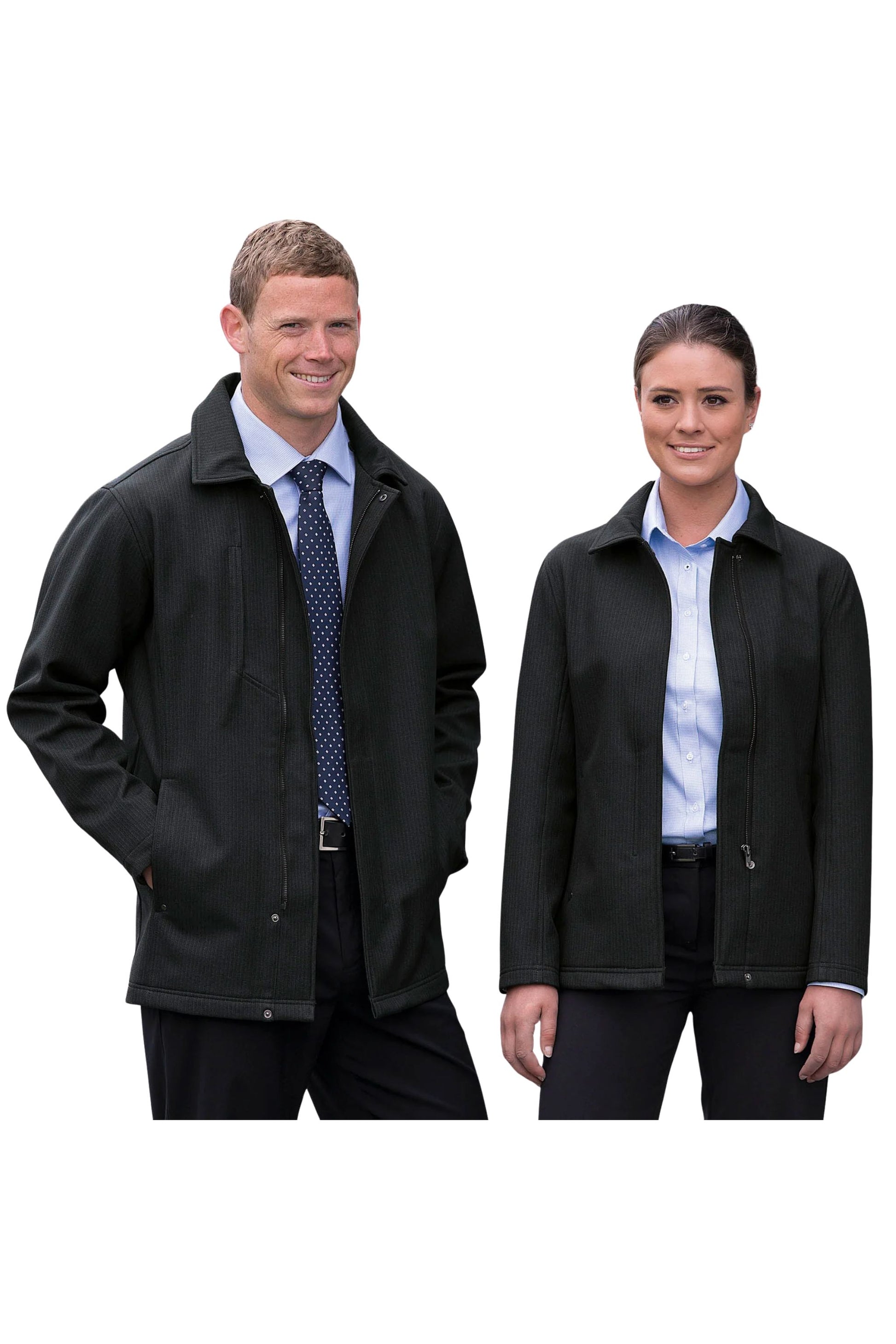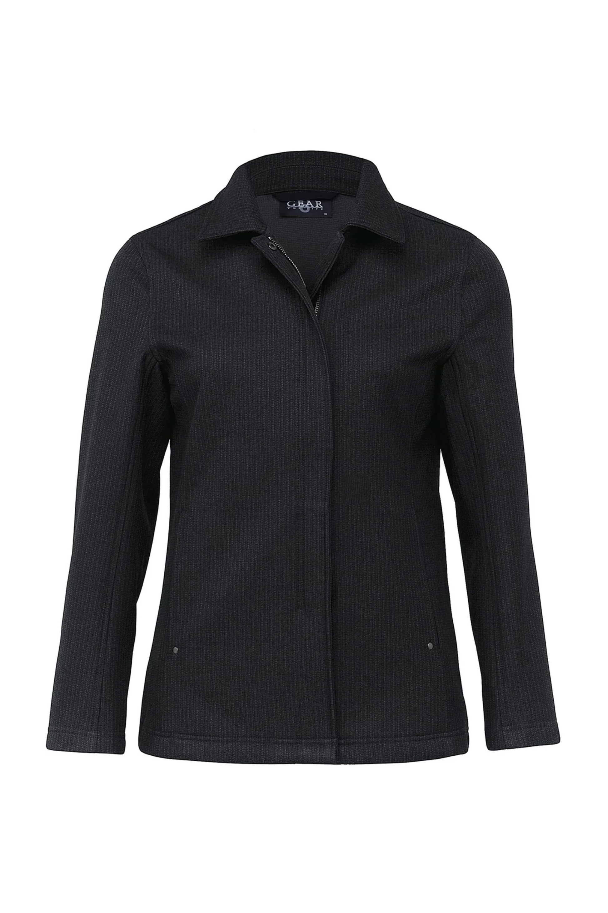 100% polyester herringbone softshell bonded with anti-pill microfleece. Tapered-fit ladies jacket with a two-piece self-fabric collar and concealed zippered placket with hidden domes and external storm flap. Welt zippered chest pocket, side panel detail, topstitch detailing, and welt side pockets with MP3 exit and rivet detail. Wind resistant, breathable, showerproof, and a water repellent rating of 5000 mm.