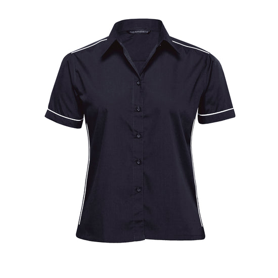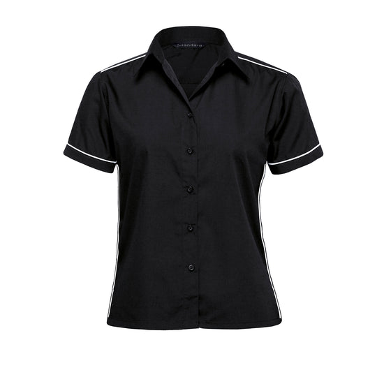 65% Polyester/, 35% Cotton poplin treated with DuPont Teflon. Classic fit short sleeve ladies blouse with contrast piping detail/, casual shirt collar and side splits on straight hem.