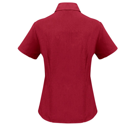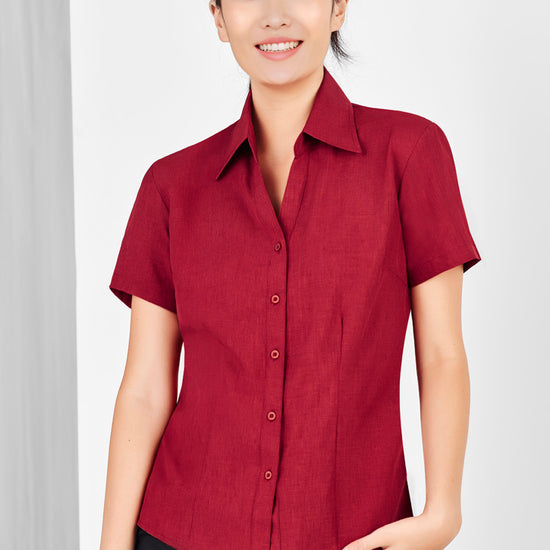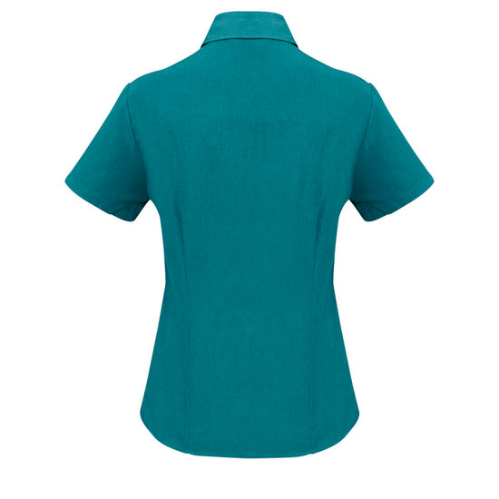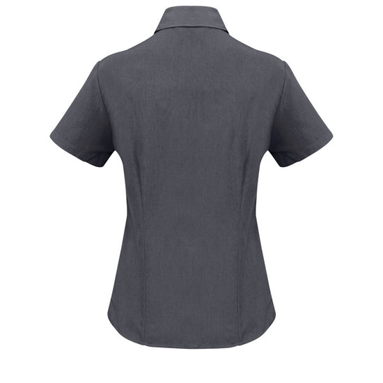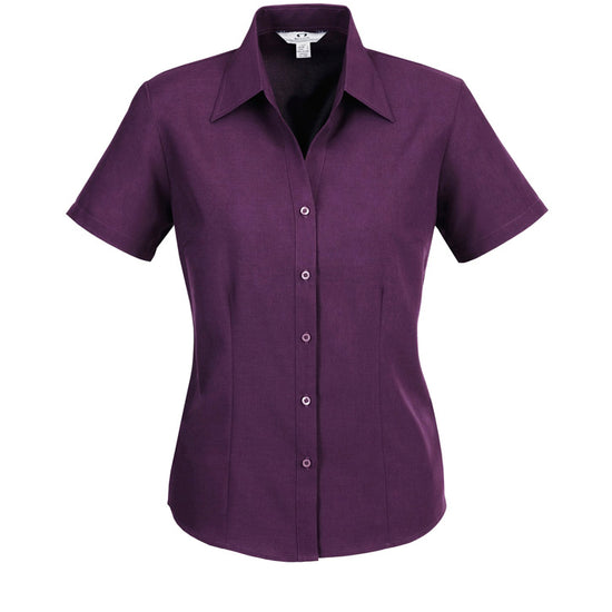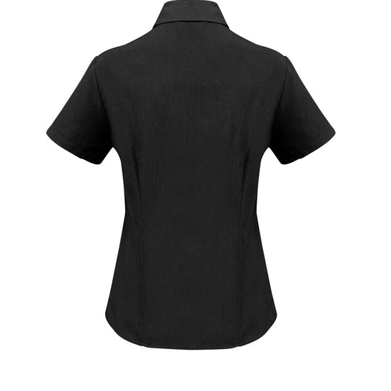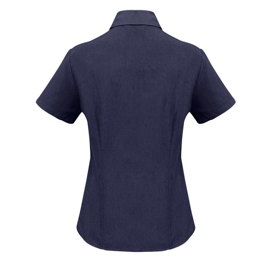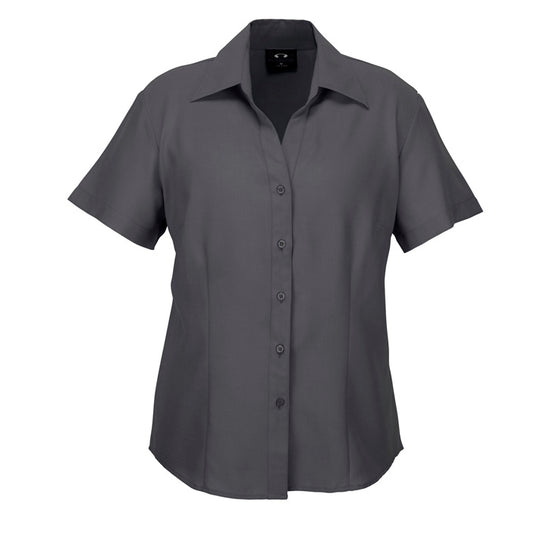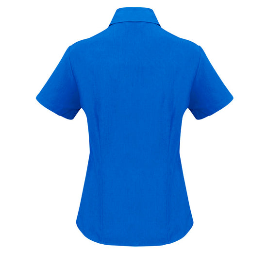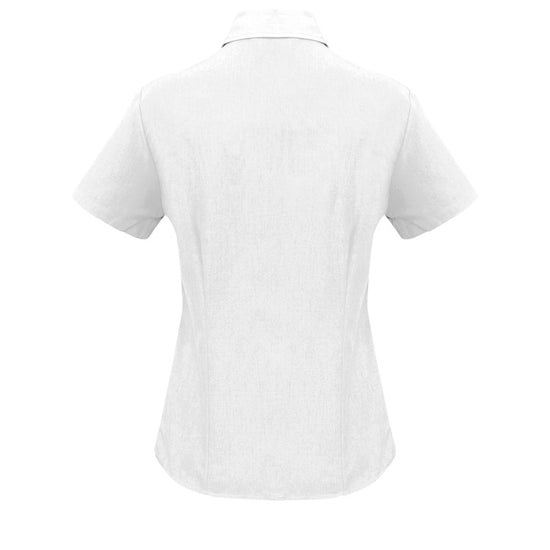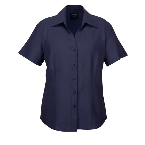 Ladies semi fitted blouse with short sleeves and curved hemline. Open neckline with slimline placket front. 100% reathable Polyester fabric is easy care and yarn wicked to keep you cool.