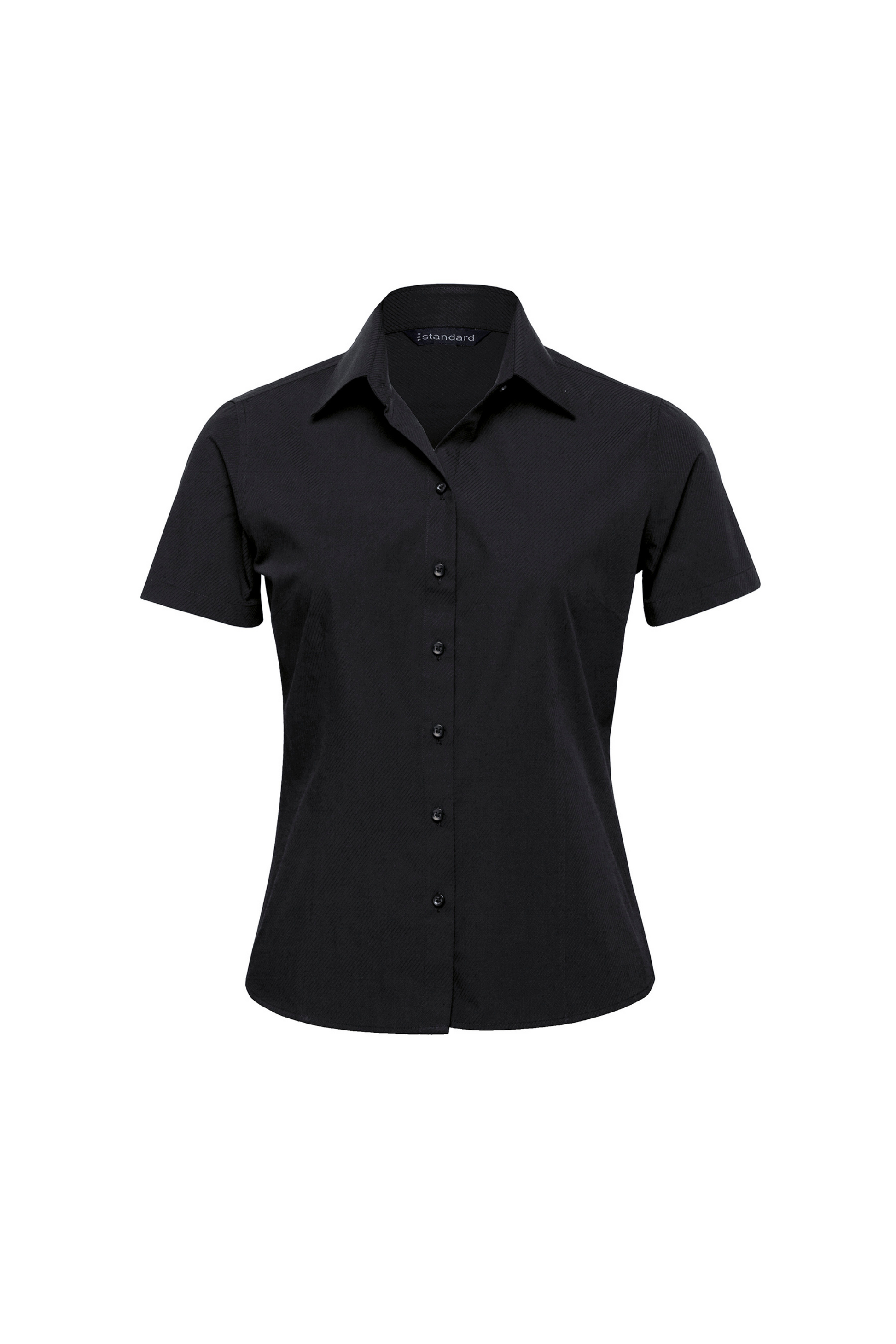 65% Polyester/, 35% Cotton bias stripe twill yarn dyed/, tapered fit blouse with casual fashion collar/, shaped body detailing on front and back/, short sleeves and contoured hemline.