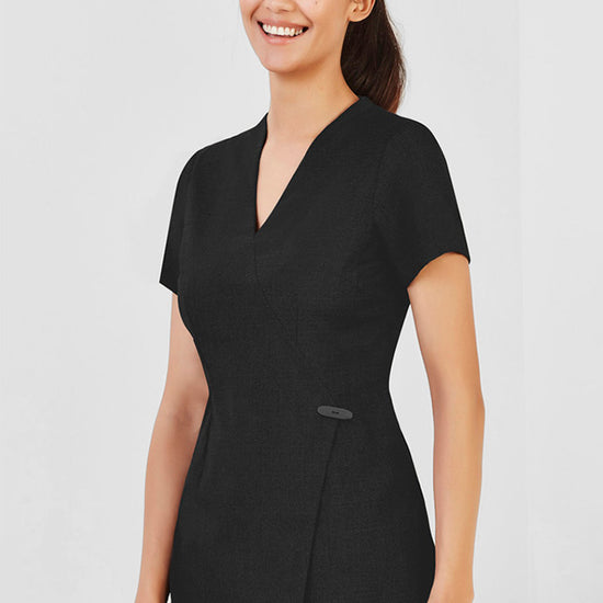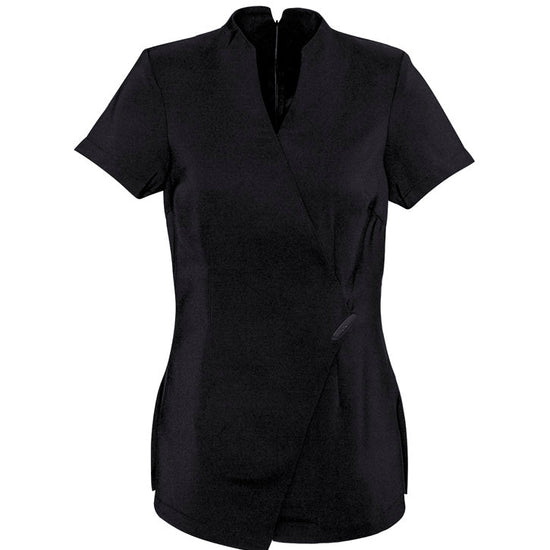 The spa tunic is a designer style in a linen like fabric which reflects the trend for contemporary nature inspired environments. This lightweight fabric offer superior draping and quick drying comfort throughout the day with Dupont Teflon stain release performance keeps the stains and spills at bay.  The stretch fabric resists creasing and maximizes comfort and movement, it is also shrink and fade resistant. The tunic features an asymmetrical faux wrap front and elegant neckline and horn-toned button.