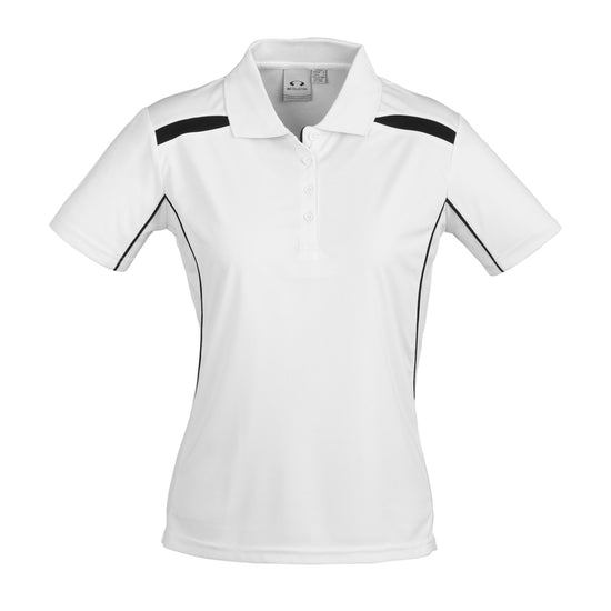Ladies polo shirt with contrast shoulder panels and piping and matching knitted collar made from 100% Breathable Polyester. New stretch sports interlock fabric with back and underarm mesh panel inserts for breathability.