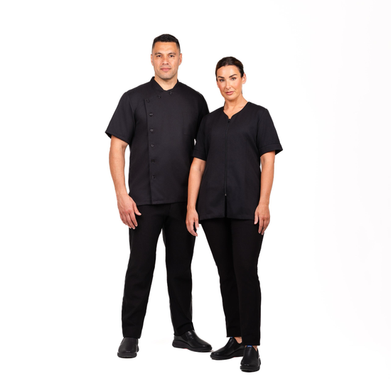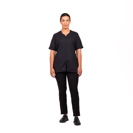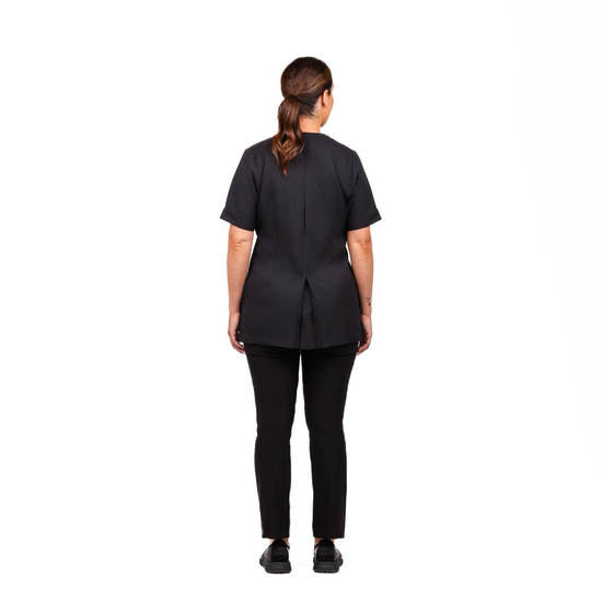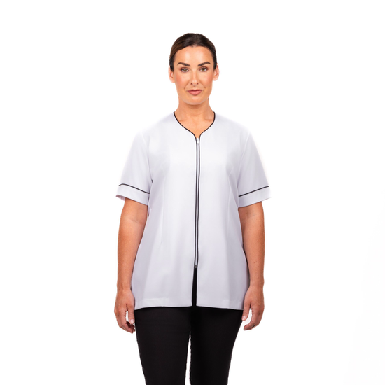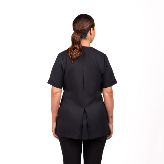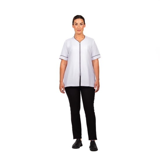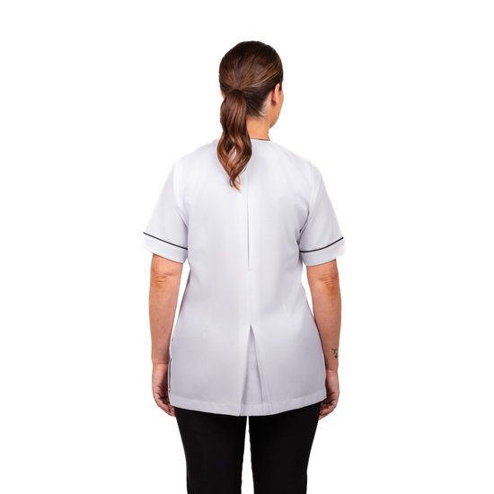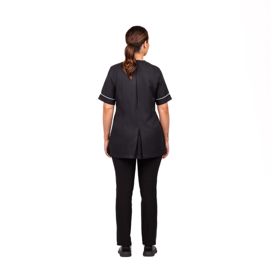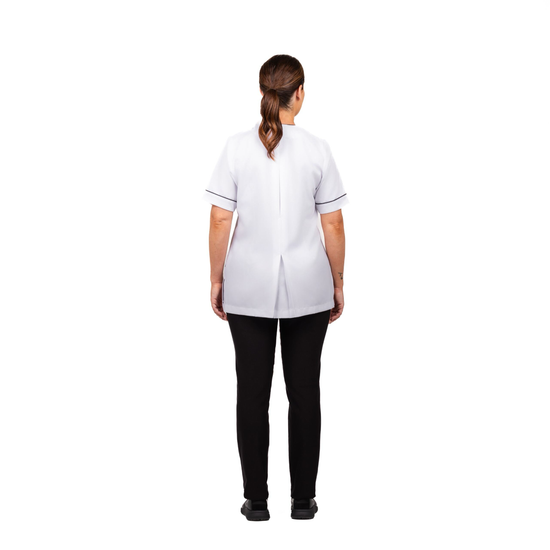 The Linda Tunic is a collarless V-neck style tunic with shaping and trim details for a flattering finish. The Polyester Cool Comfort fabric provides body temperature regulation and moisture control, and the action back and side splits allow for easy of movement.