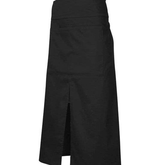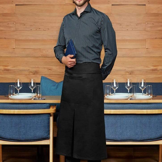 Full length Continental style Apron with a fold over waist/, towel loop at the back and front centre split for ease of movement .A large central pocket at the front has provision for a bottler opener and special side slide pen. Unique styling with free size of 86cm x 86cm. Made from 65% Polyester and 35% Cotton Twill/, 190 GSM.