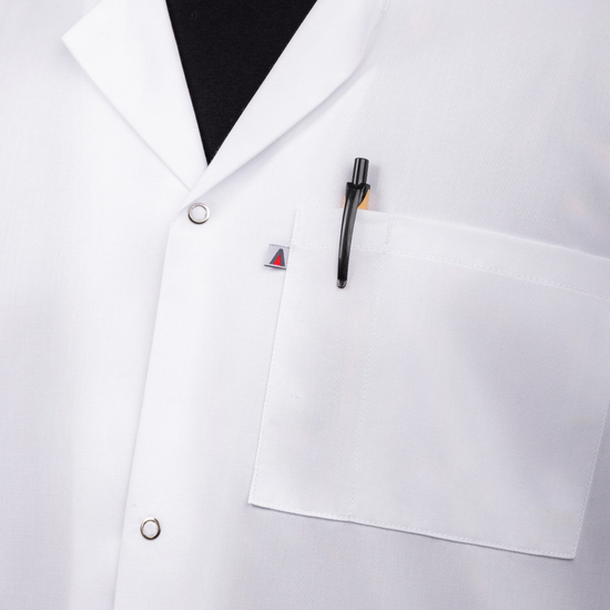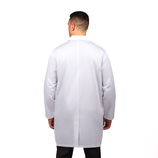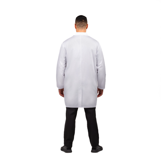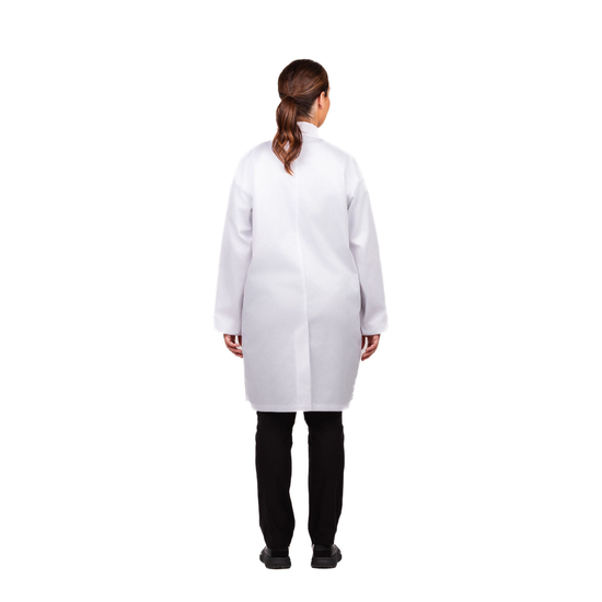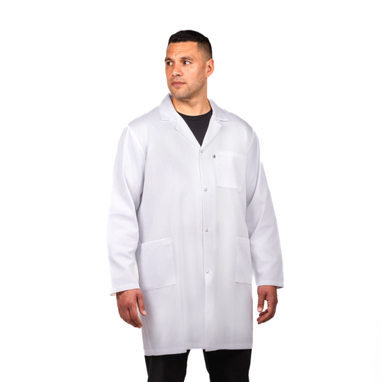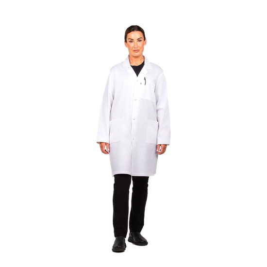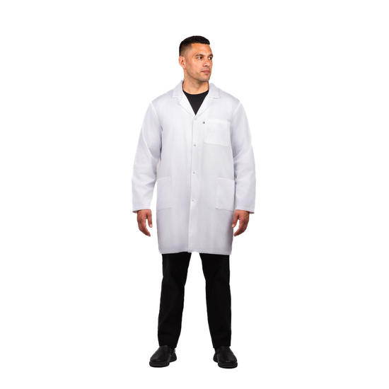 This is a unisex long sleeve dustcoat below the knee length for full coverage. Front has a chest pocket with pen divider, two hip pockets and metal domed front. A centre back slit allows for ease of movement.