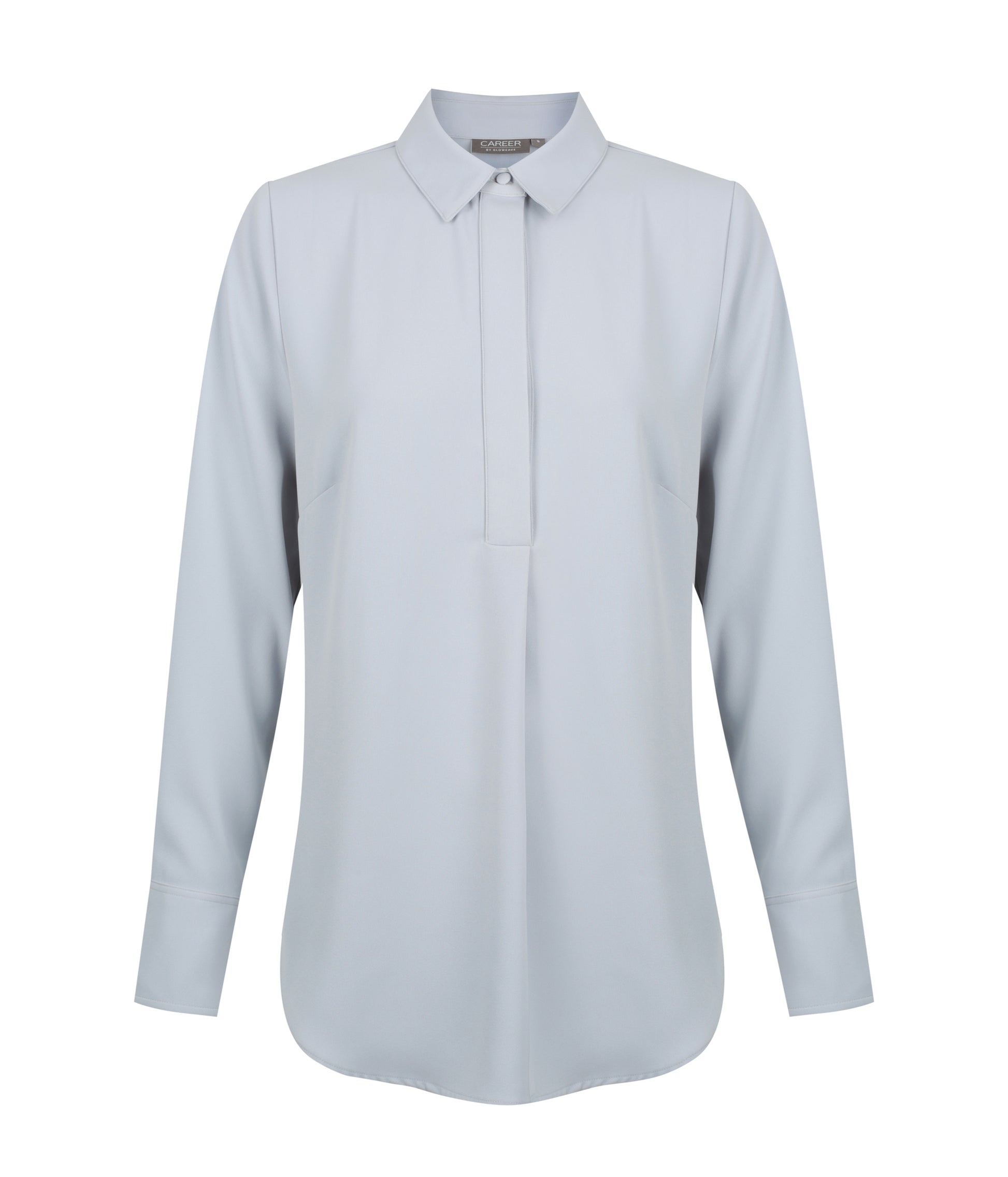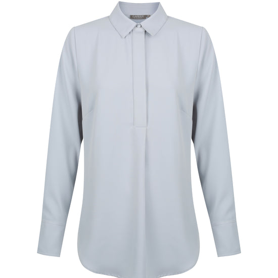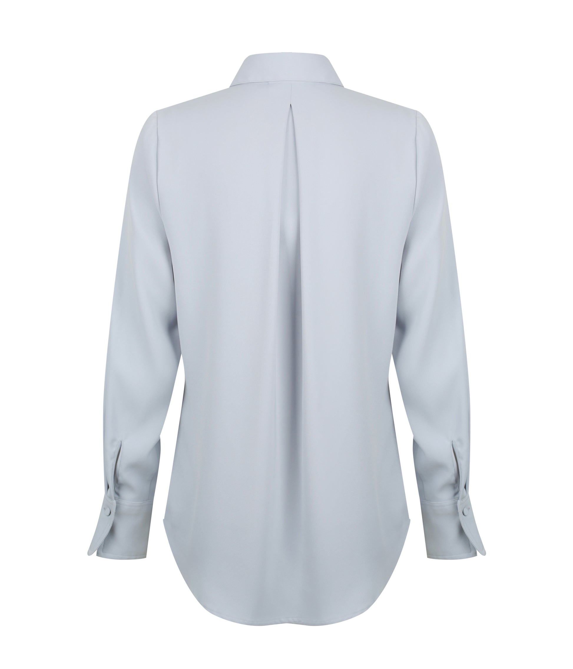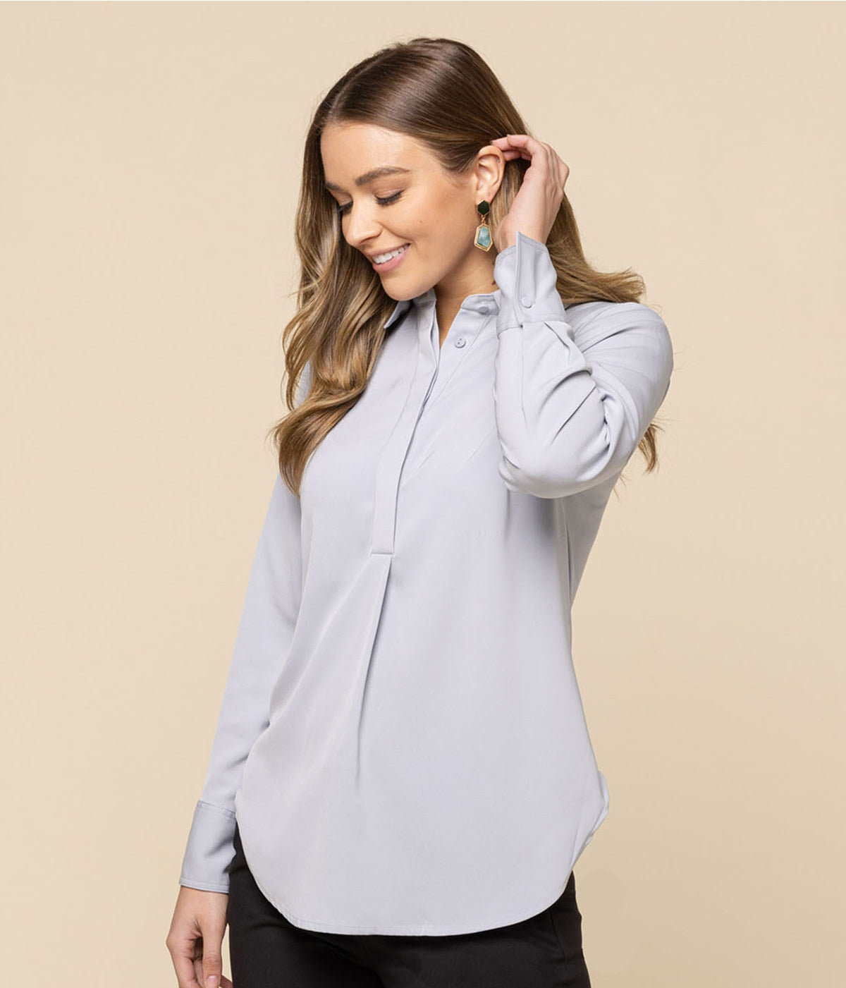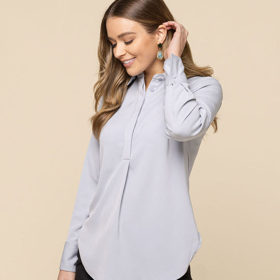 The Quinn long sleeve shell top is fabricated in a luxe twill fabric that feels beautiful on the skin. It features mitered cuffs a concealed ½ placket and an inverted centre back pleat. This top is machine washable and therefore an easy care everyday top that can be worn cross seasons.