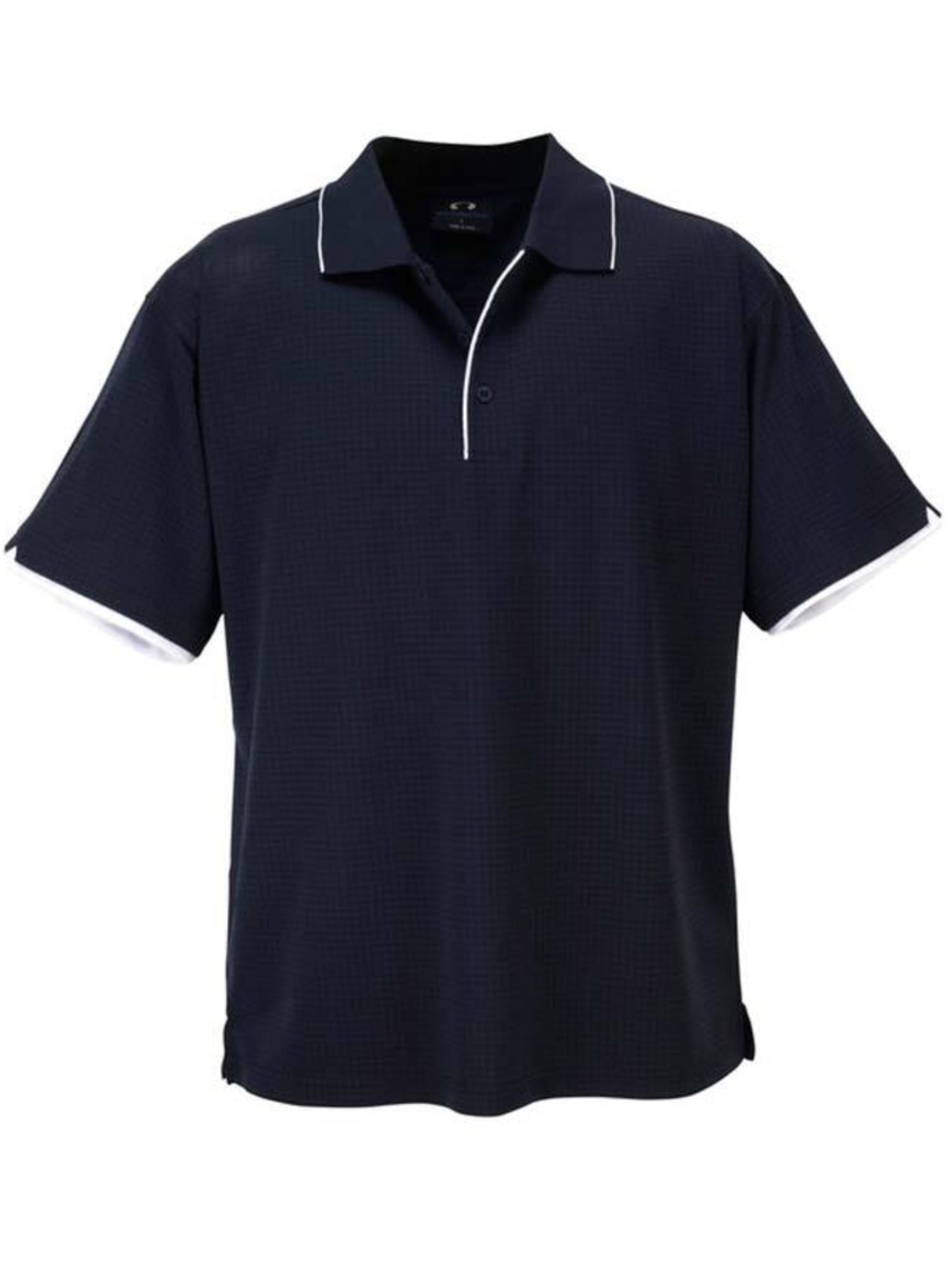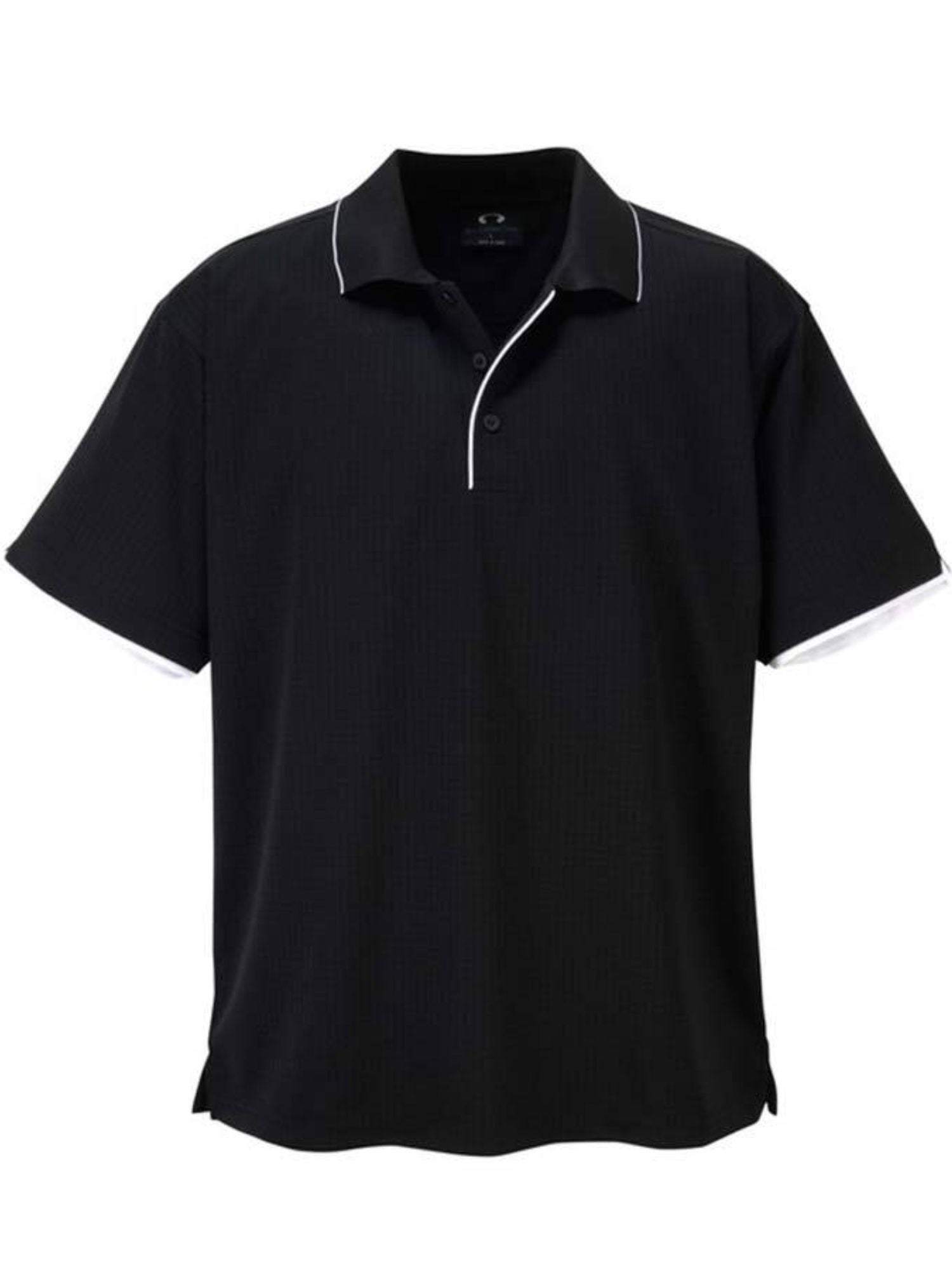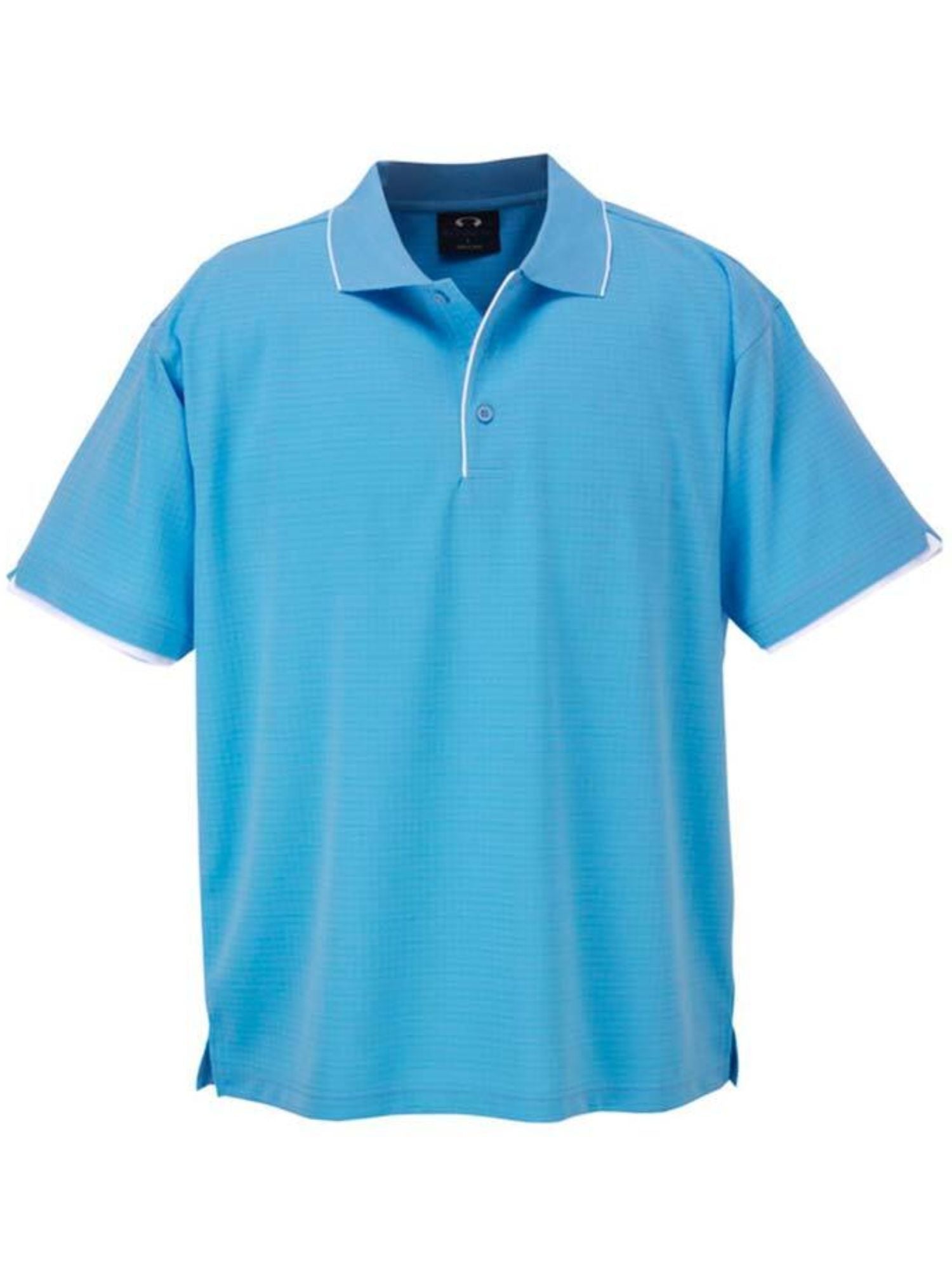 Mens Self-Check Polo with contrast self fabric trim on the placket and sleeve hem/, and contrast tipping on a knitted collar. Includes a loose pocket and side splits. Made from 100% Breathable Polyester/, 170 GSM and excellent UPF rating.