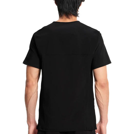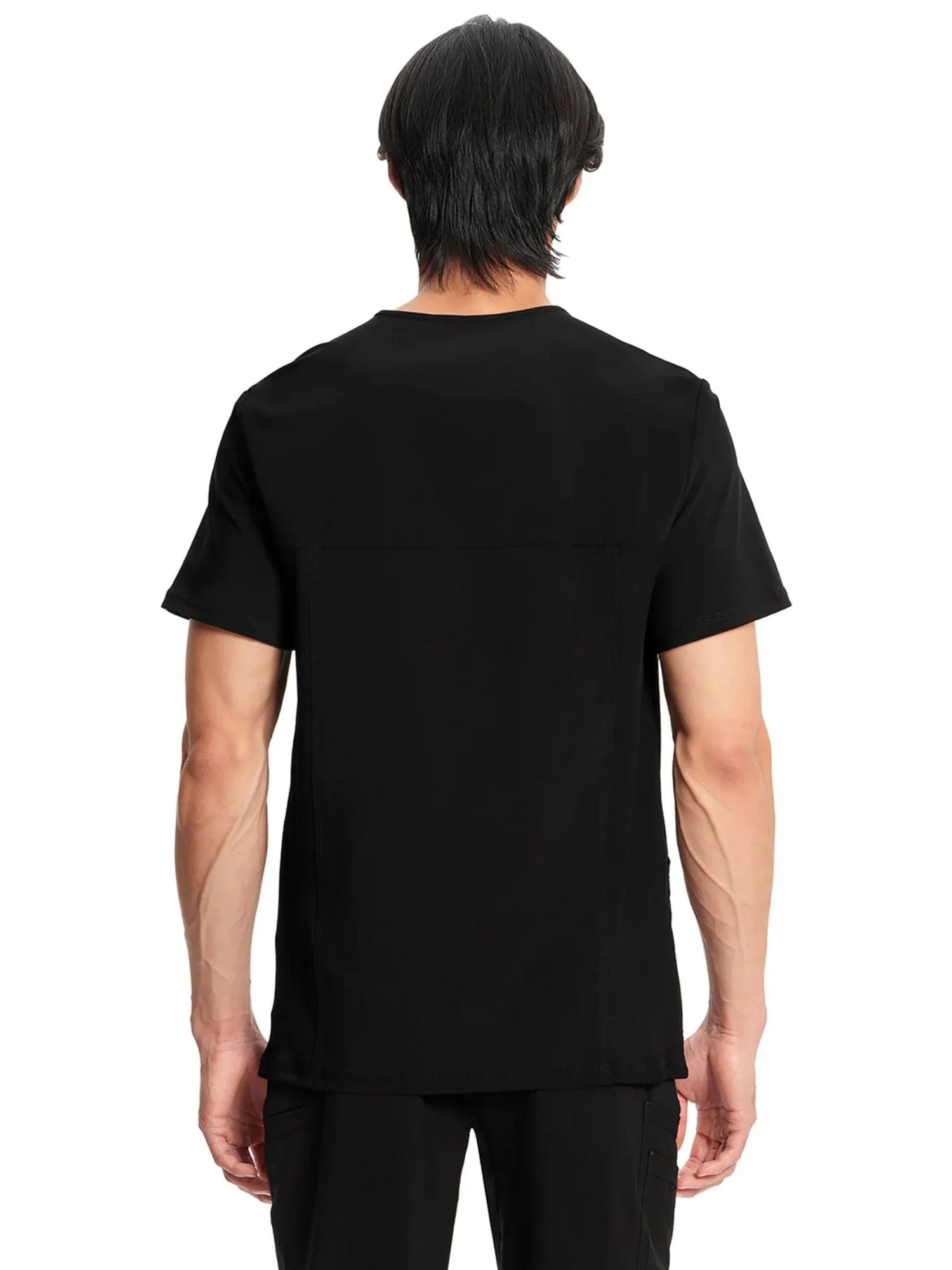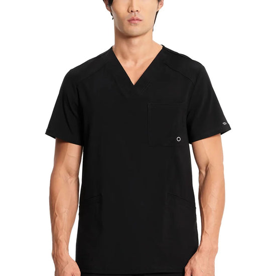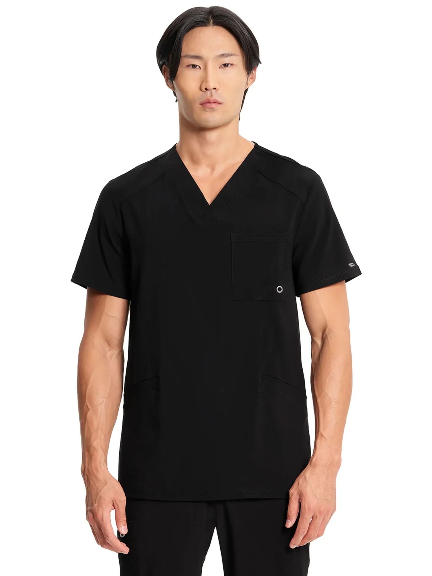 A men's athletic-fit V-neck top features a chest pocket with grommet detail, front welt pockets with triple-needle topstitching, front and back yokes, and stretch rib-knit back panels for extra comfort.