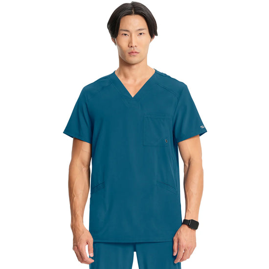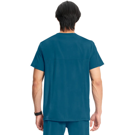 A men's athletic-fit V-neck top features a chest pocket with grommet detail, front welt pockets with triple-needle topstitching, front and back yokes, and stretch rib-knit back panels for extra comfort.