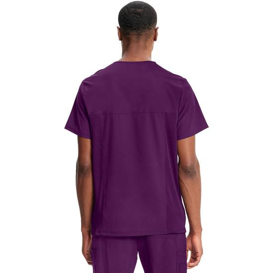 A men's athletic-fit V-neck top features a chest pocket with grommet detail, front welt pockets with triple-needle topstitching, front and back yokes, and stretch rib-knit back panels for extra comfort.