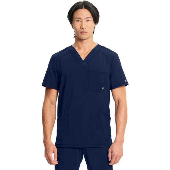 A men's athletic-fit V-neck top features a chest pocket with grommet detail, front welt pockets with triple-needle topstitching, front and back yokes, and stretch rib-knit back panels for extra comfort.