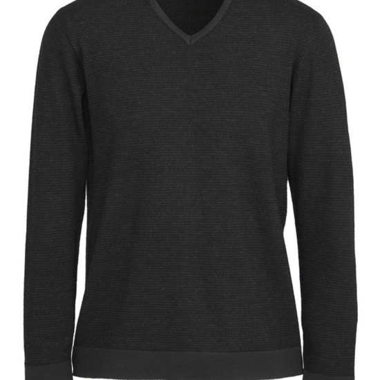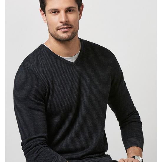 The men's V-neck fully fashioned jersey is a contemporary style and fit. 100% Merino wool with subtle stripe detail.