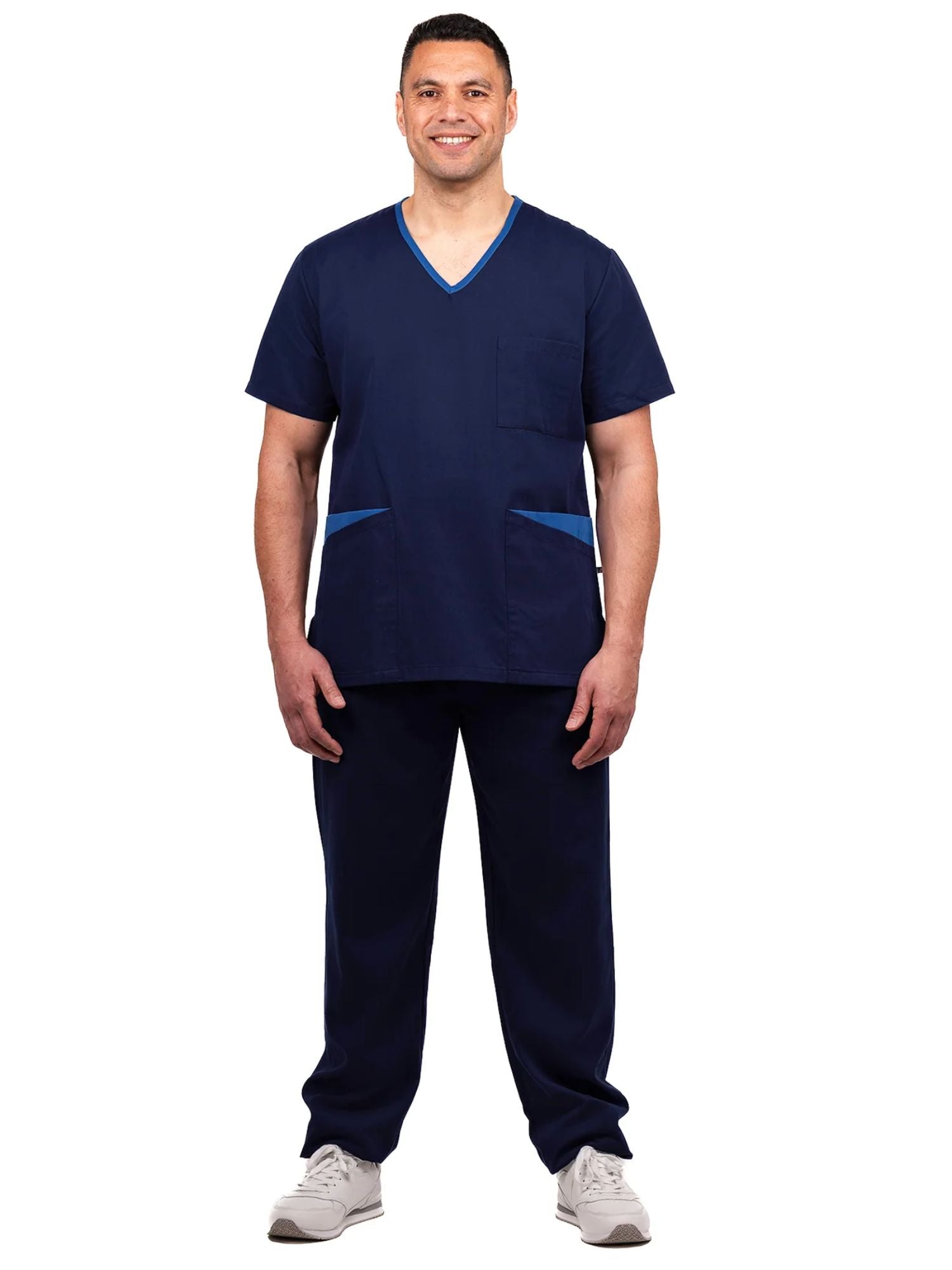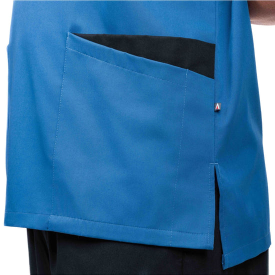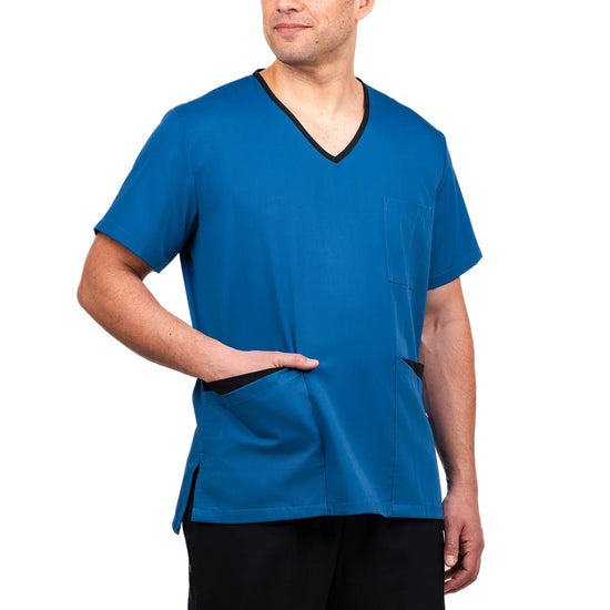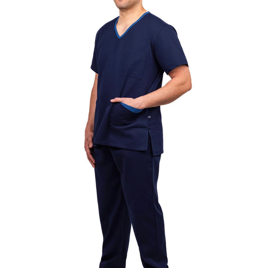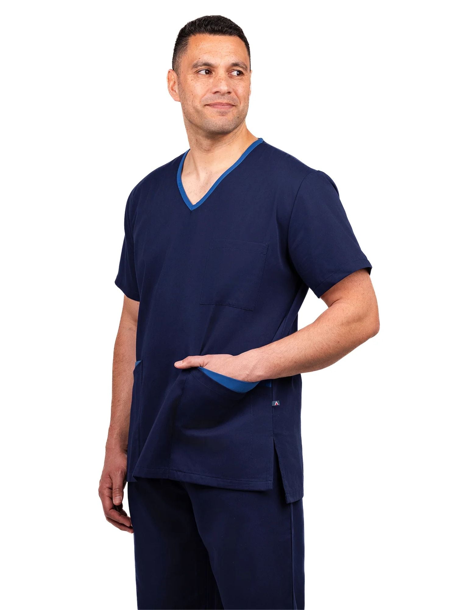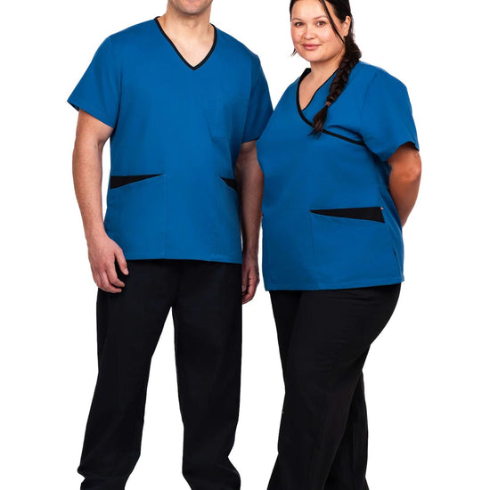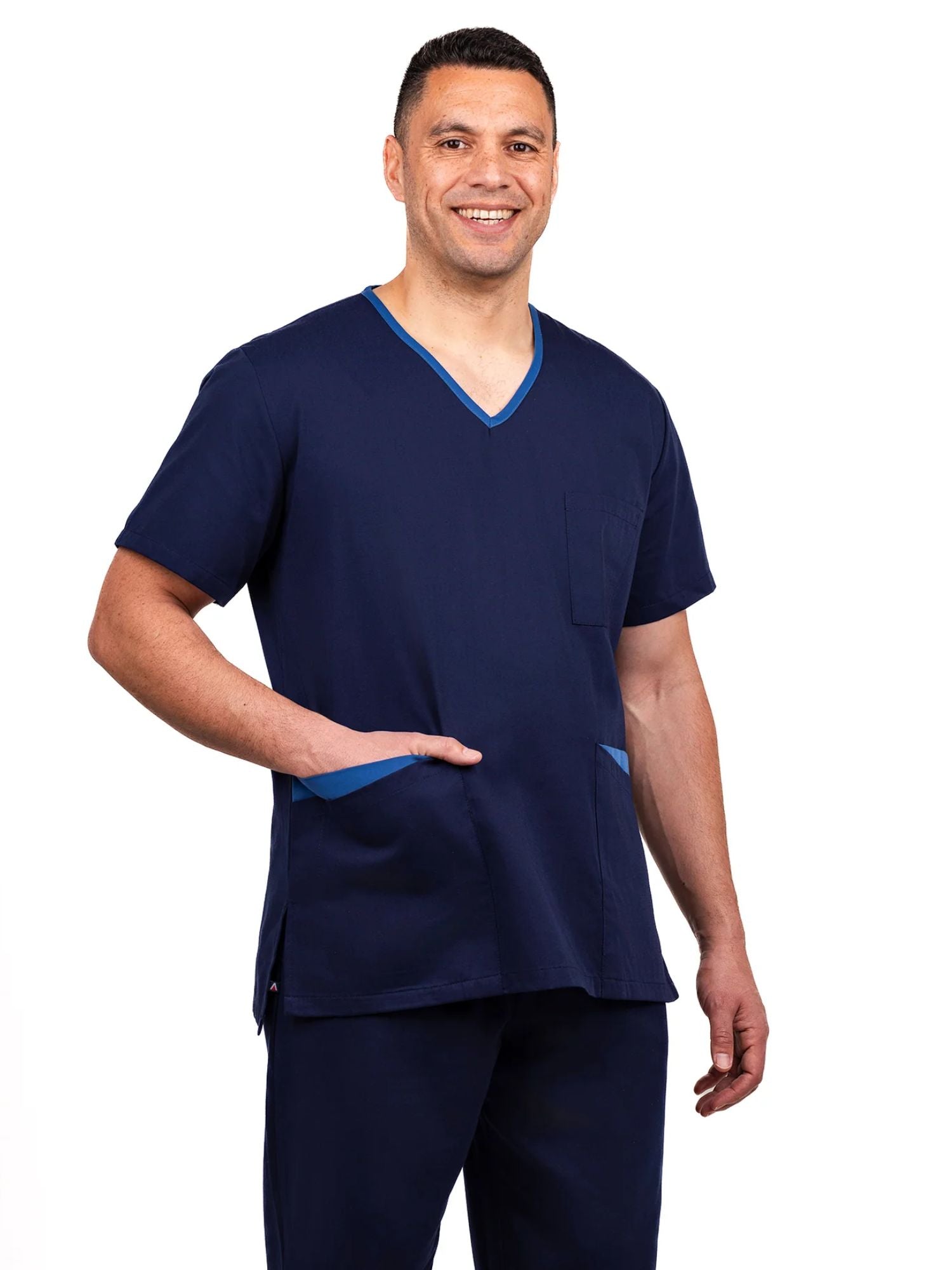 A V-neck design scrub with contrast detailing along neckline and pockets. This style has a chest pocket, two hip pockets with concealed contrast pockets and side seam splits to allow for ease of movement.