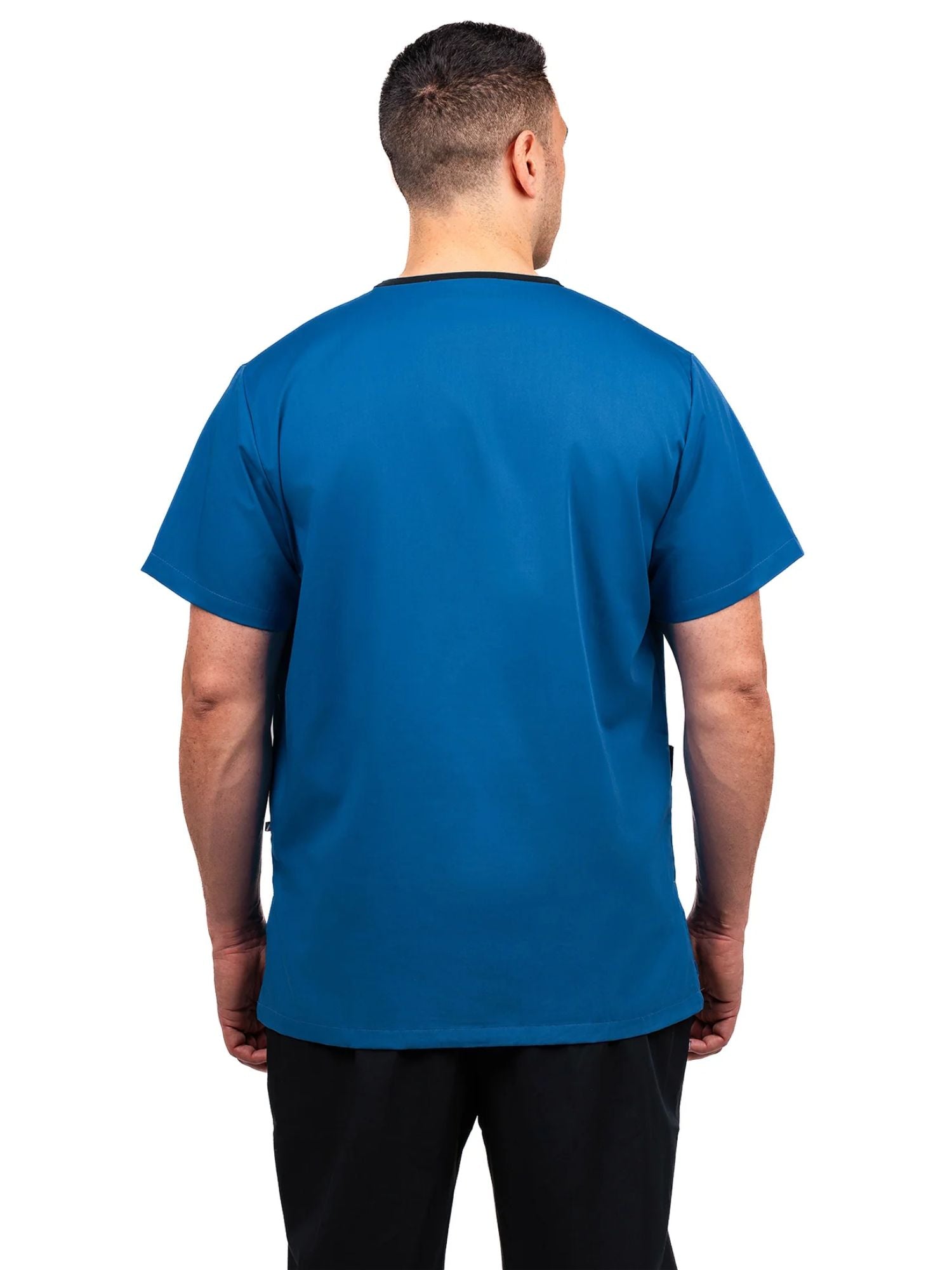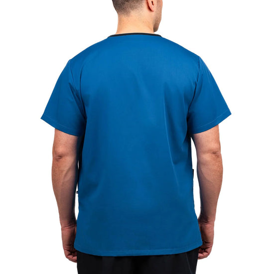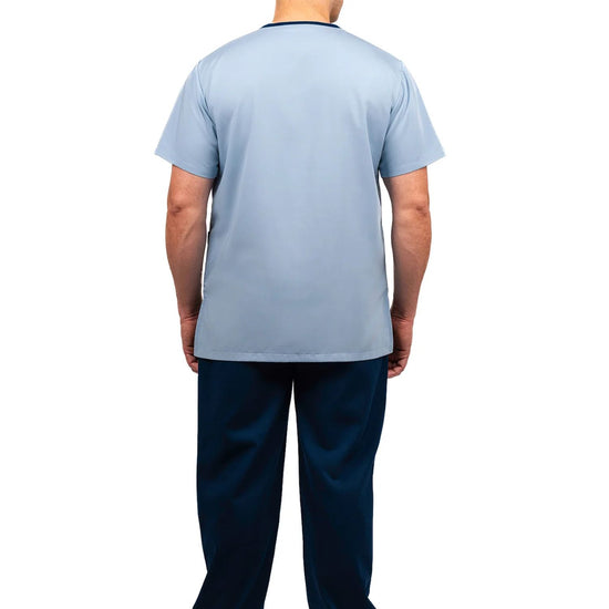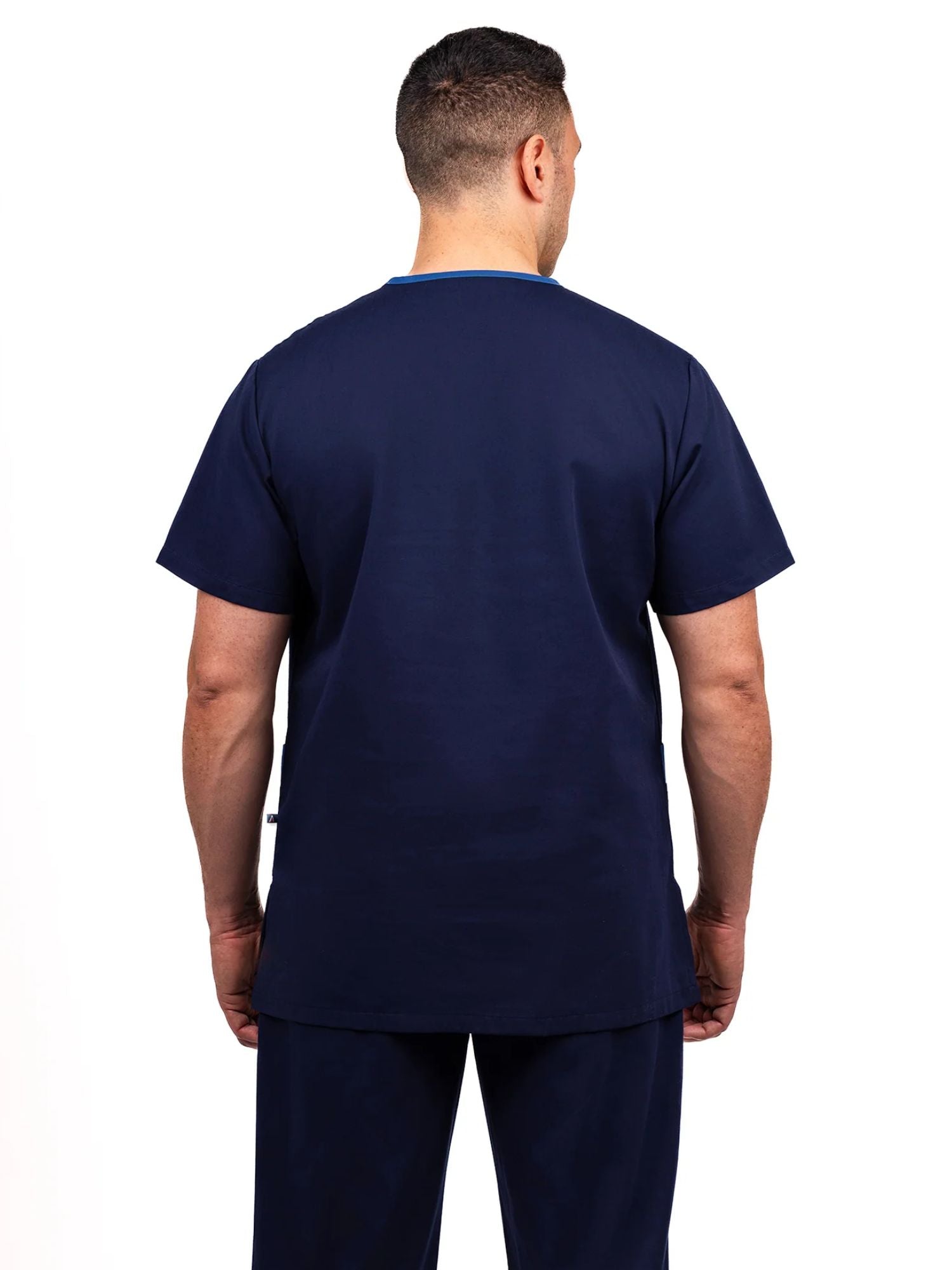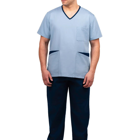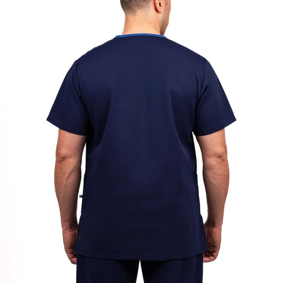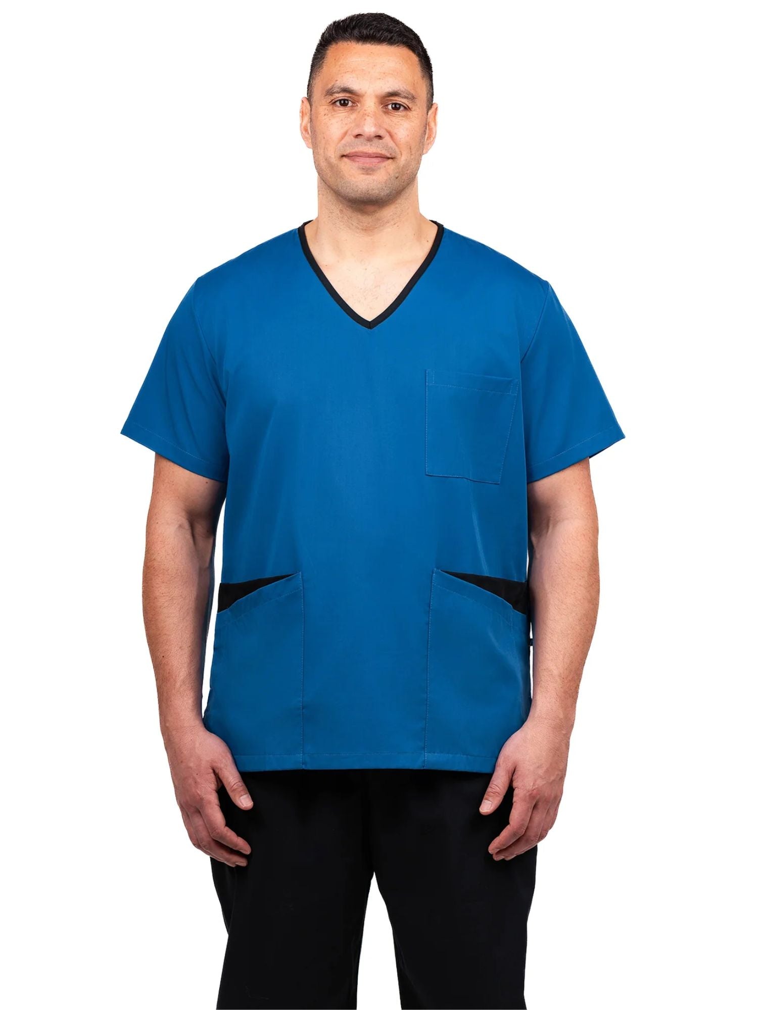 A V-neck design scrub with contrast detailing along neckline and pockets. This style has a chest pocket, two hip pockets with concealed contrast pockets and side seam splits to allow for ease of movement.
