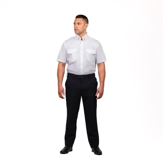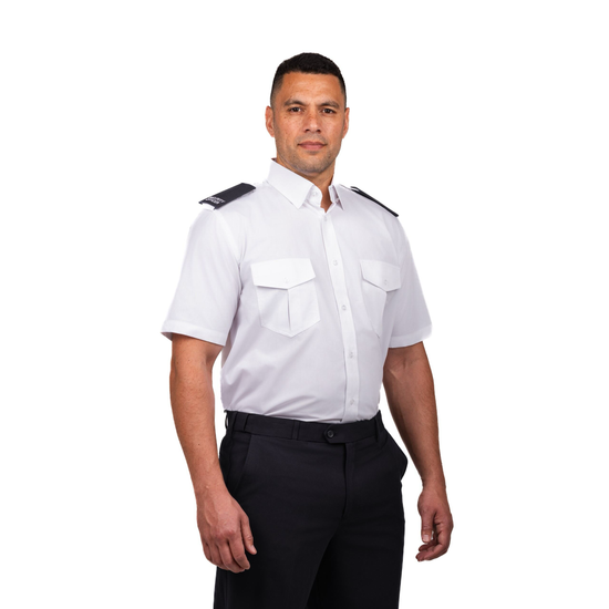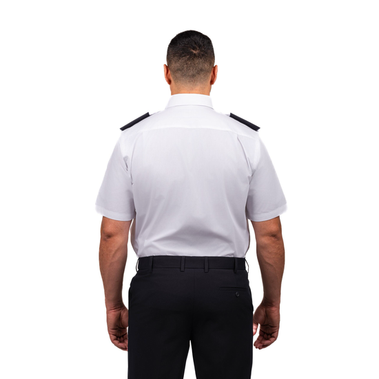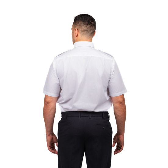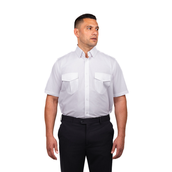 Our Short Sleeve Epaulette Shirt is a button to neck regular fit design with back shoulder pleats for ease of movement and epaulettes. Also features two pleated chest pockets with protective flaps and button fastening for security.